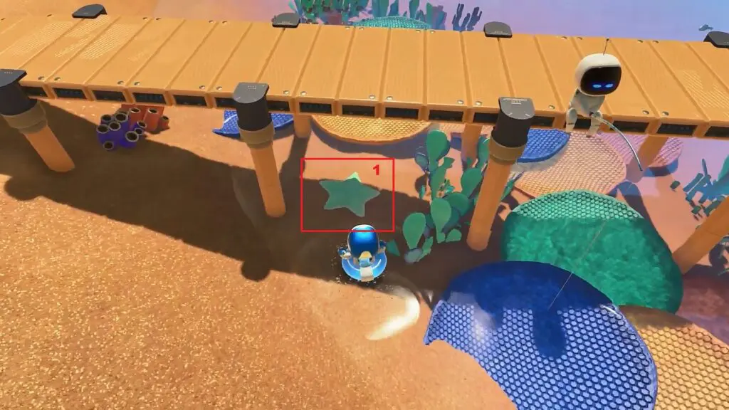 Once you have stepped on the four stars in the correct order, the special bot will appear in front of the fourth sea star as shown in the picture below. The but will be caged, and now you need to rescue it.