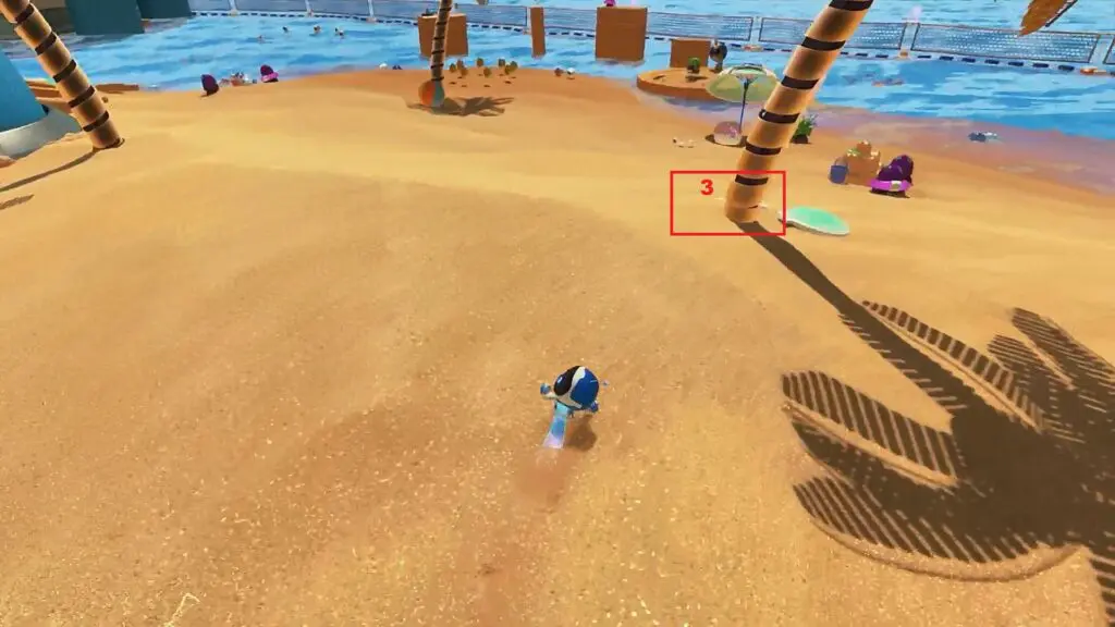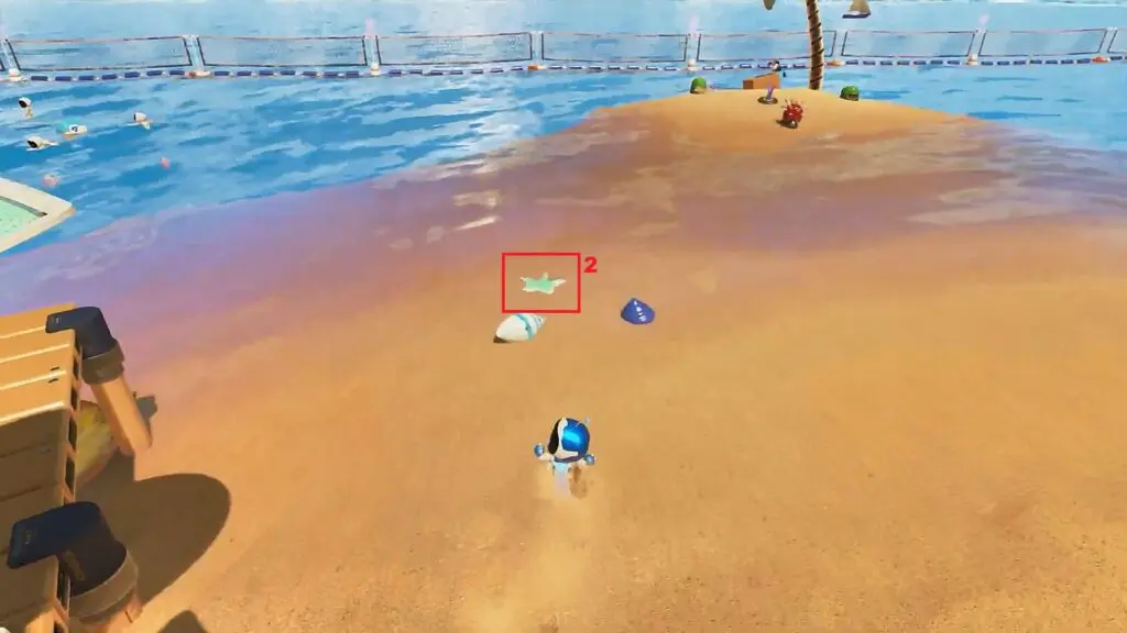 Now you have to collect 4 Sea Stars in specific stars. The location of the four stars and the sequence you need to collect them in are shown in the pictures below. The first star is underneath the pier on the right side. Then go to the left side of the area and you will find the next star underneath the water. The third star is under a palm tree on the right side. The fourth and final star is under the water near the front wall on the left side.