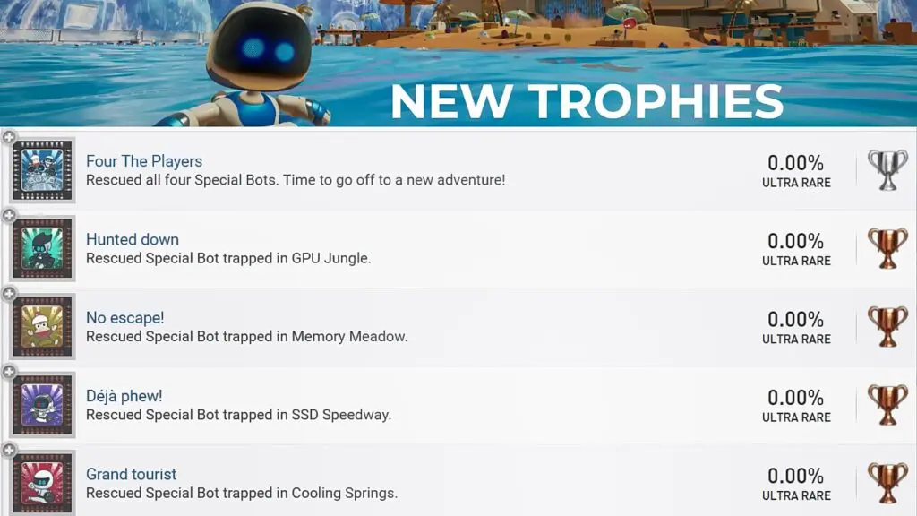 Astro’s Playroom released a new DLC Pack on 7th June 2024. The new DLC pack consists of 5 trophies as shown in the picture below. For this DLC, you will have to rescue four Special Bots. As of now, only one trophy (Hunted Down) is available. The rest of the trophies are time-locked. They will be released sequentially leading up to the release of the upcoming sequel, Astro Bot. The 2nd riddle (Deja Phew Trophy) will be released on 7th July, 60 days before the upcoming sequel. The 3rd riddle (Grand Tourist! Trophy) will be released on 2nd August, 30 days before the upcoming sequel. The final riddle (No Escape! Trophy) will be released 1 week before the release of the upcoming sequel, Astro Bot, on 31st August.