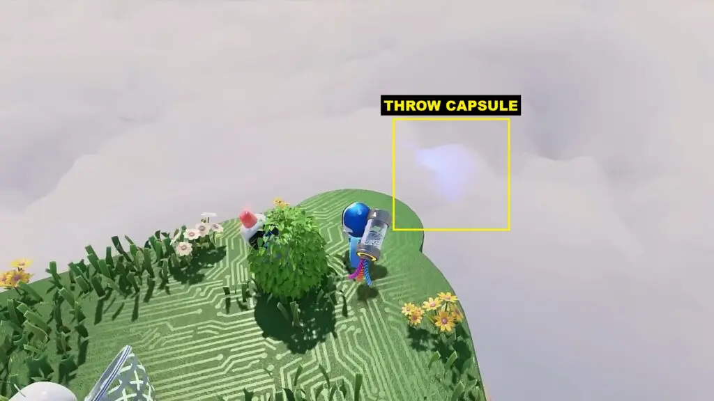 Carry the capsule and proceed ahead in the level. After crossing the second wire bridge, stand at the corner as shown in the picture below. Then throw the capsule at the blue cloud as shown in the second picture below. This will make the hidden bod come out.