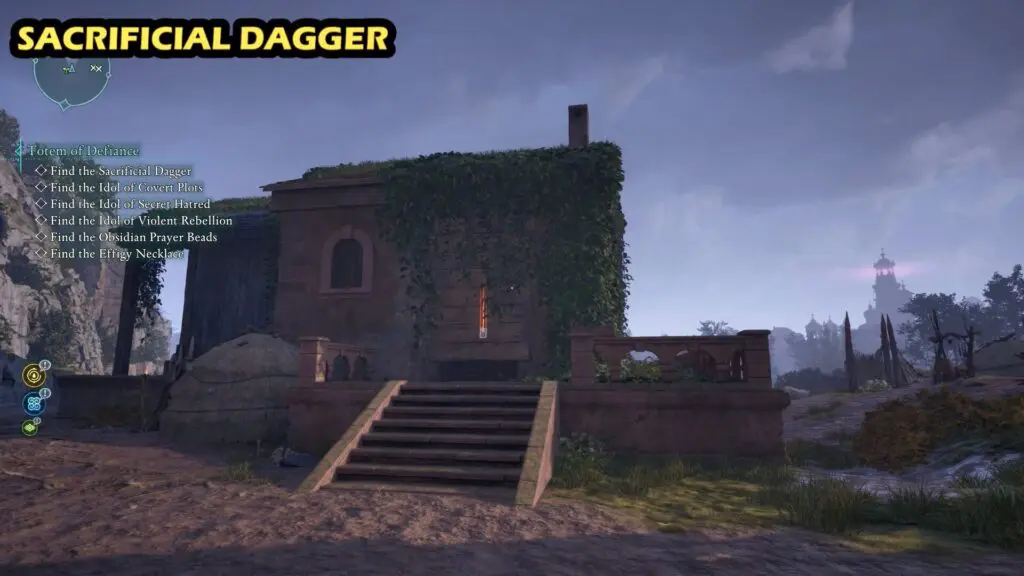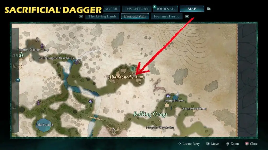 The Sacrificial Dagger is hidden on a barricaded doorway at the Abandoned Farms on the northeastern side of Emerald Stair.