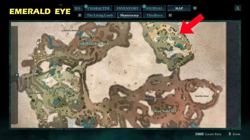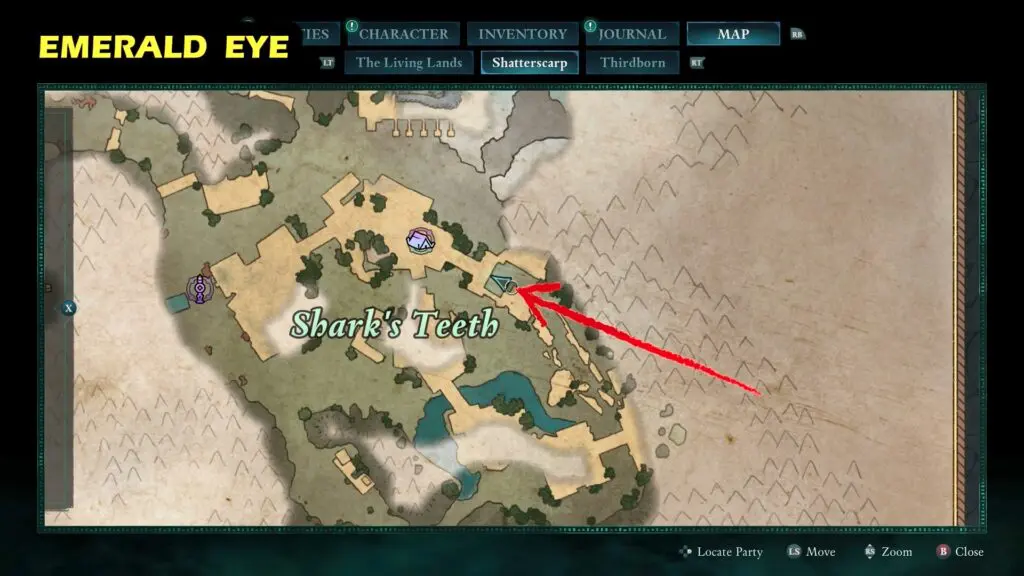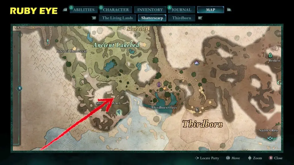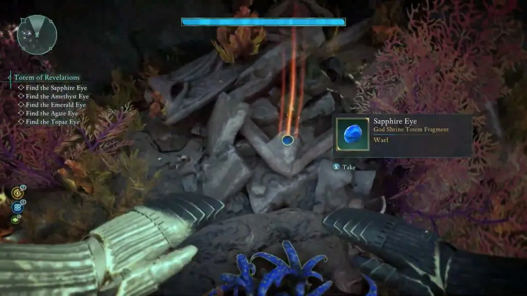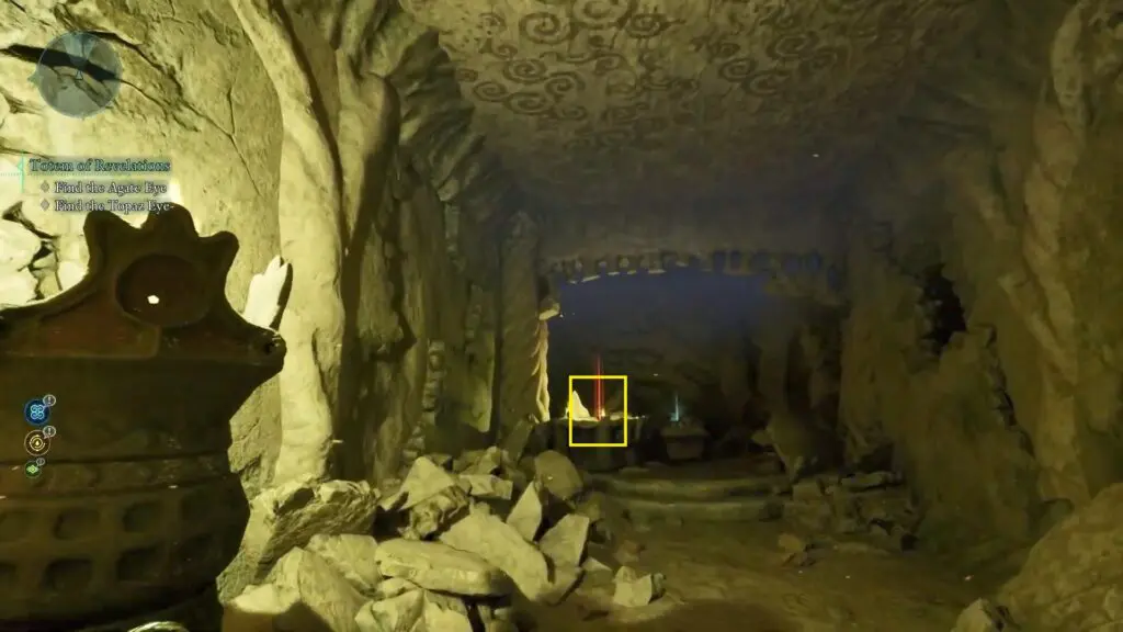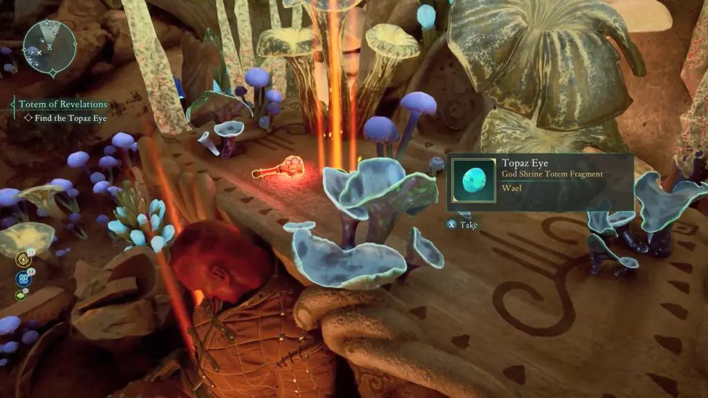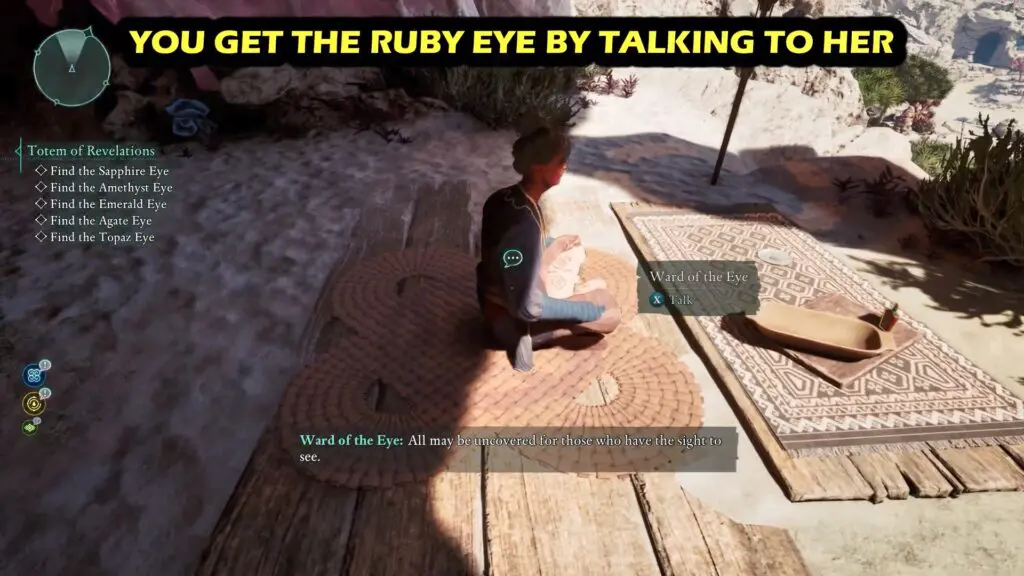 Follow the narrow tunnel opposite the Eyes of the Obscured Totem Base. You can get RUBY EYE by taking to NPC Ward of the Eye.