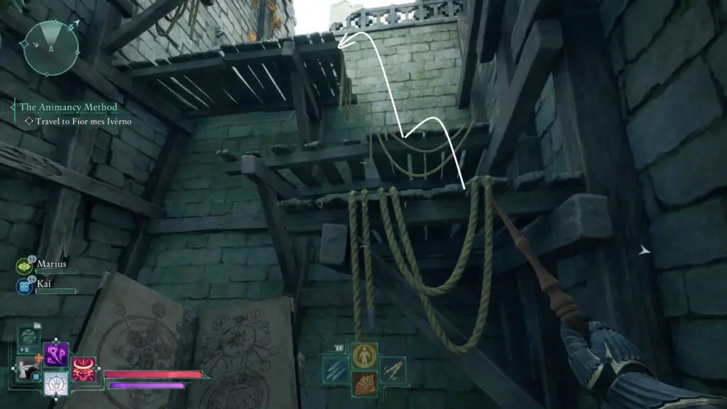 Climb up the wooden platforms to reach the stone balcony.