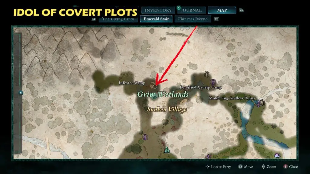 The Idol of Covert Plots is inside a building with a collapsed roof in the Grim Wetlands, north of Sunken Village