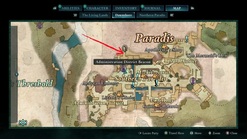 From the Administration District Beacon in Paradis, go upstairs to the Paradis Hightown entrance, but it will be locked.