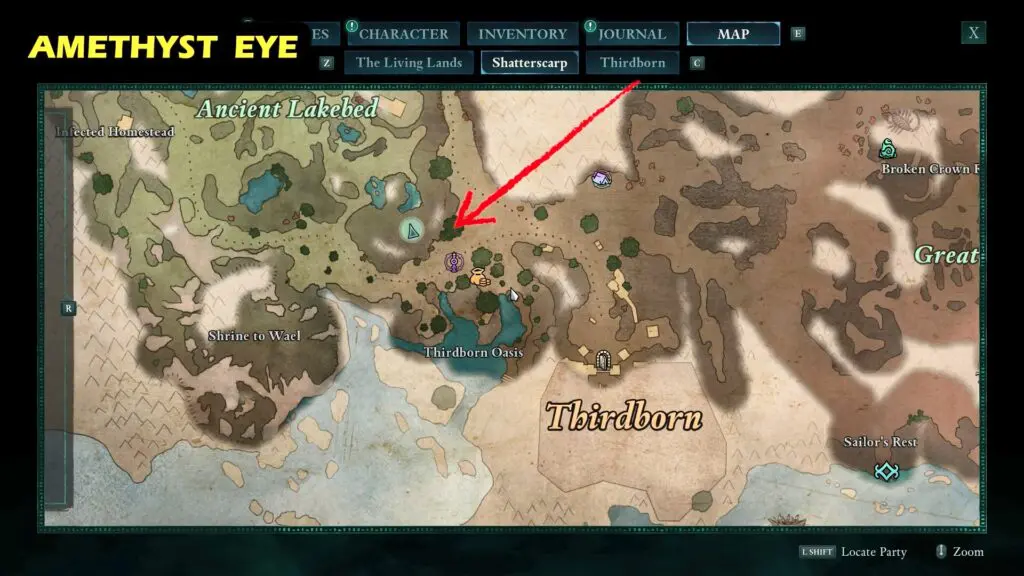 AMETHYST EYE is located southeast of the Ancient Lakebed, under the cliff.