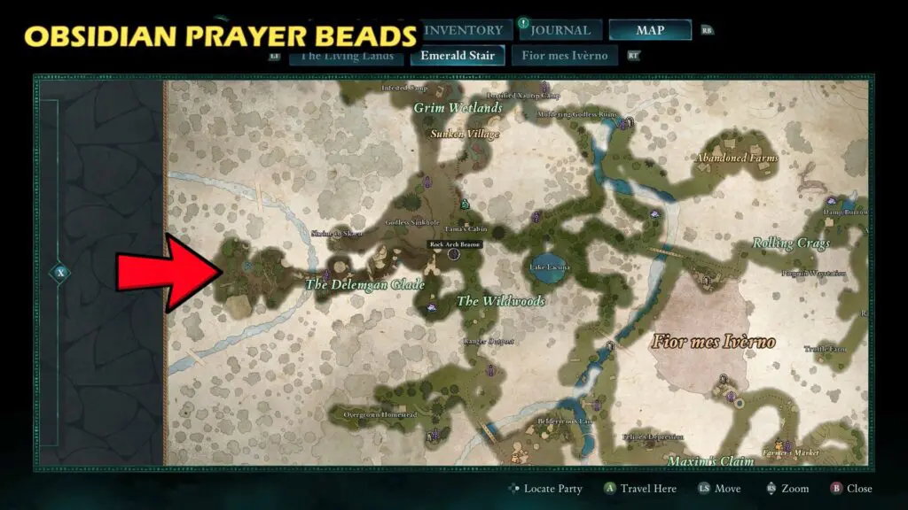 The Obsidian Prayer Beads are located next to a skeleton on the western side of the Delemgan Glade.