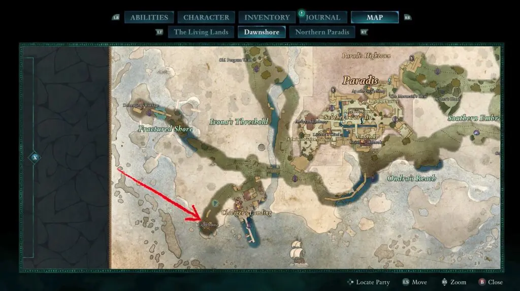 Head to the lighthouse west of Claviger’s Landing in Dawnshore.