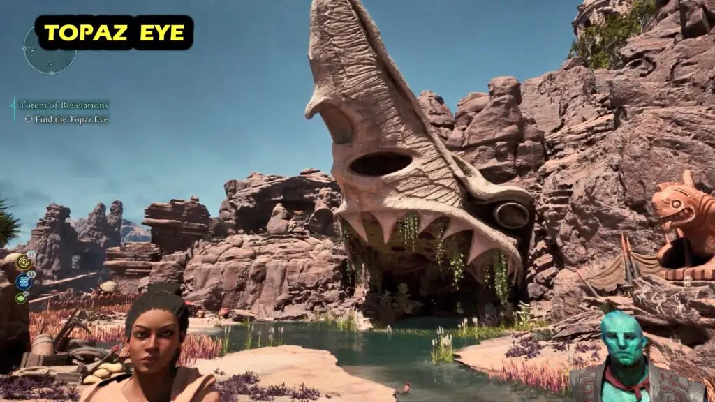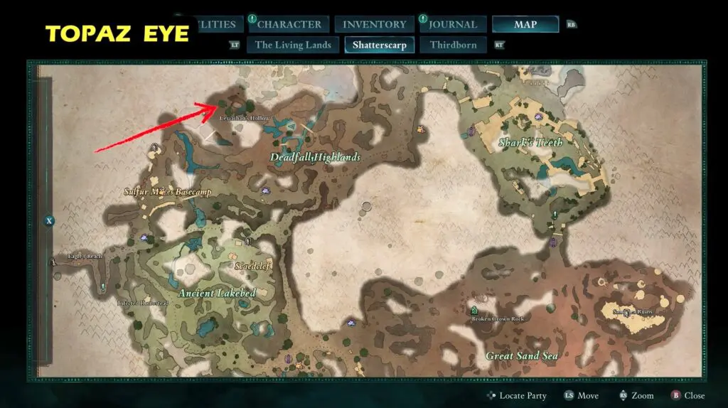 It is located in Leviathan’s Hollow. Enter inside the skeleton-shaped cave to find Topaz eye.
