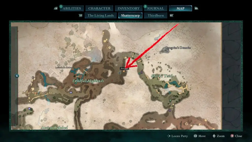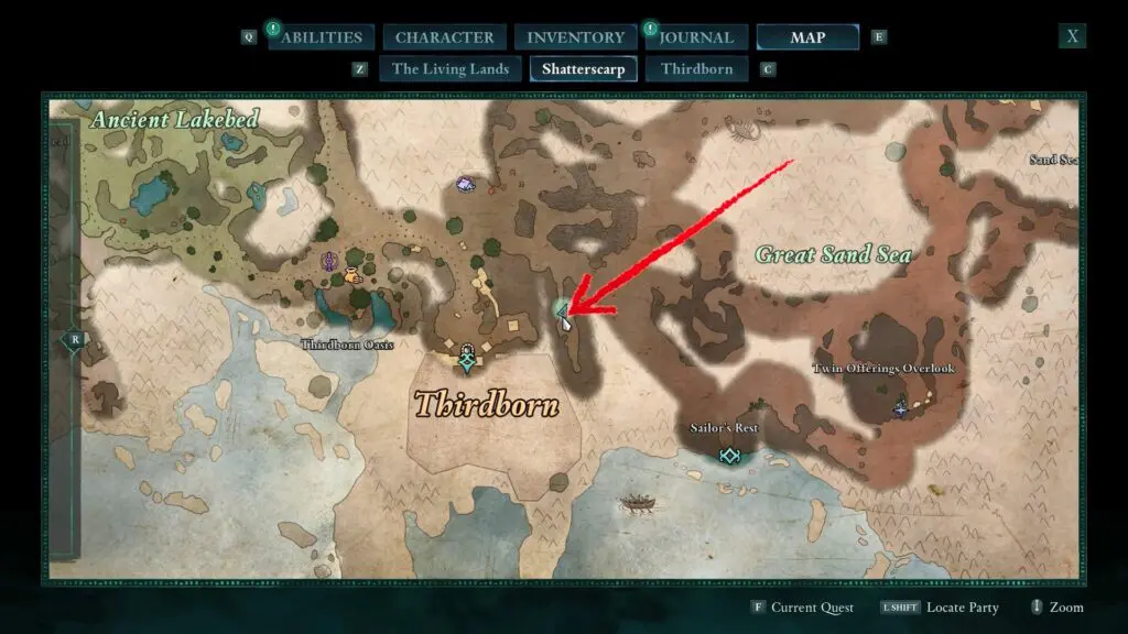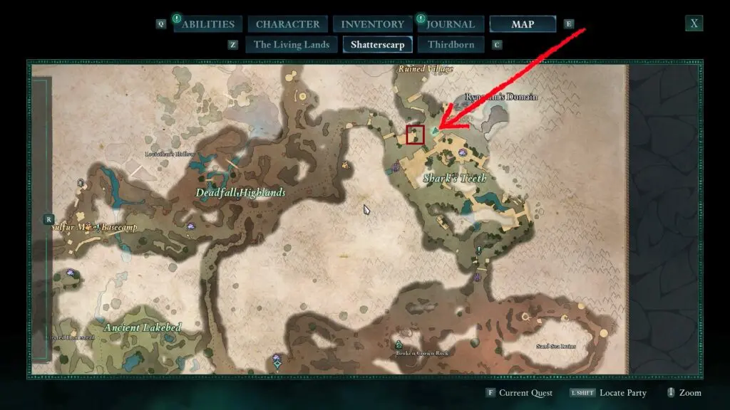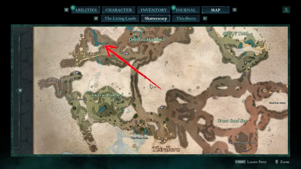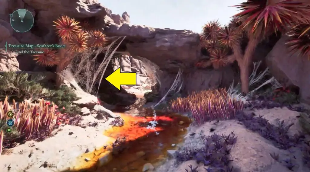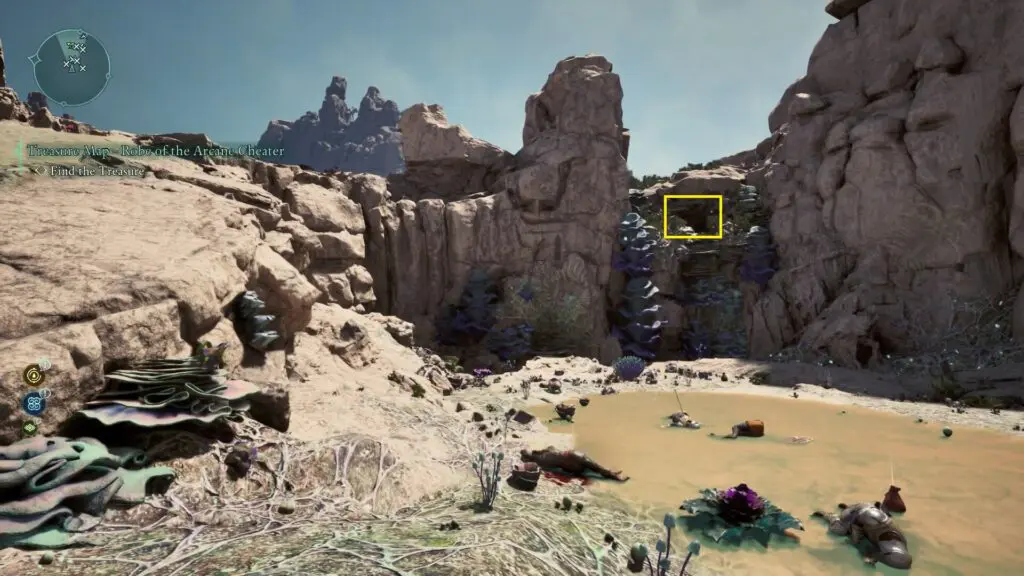 Next, head to the red riverbed, northeast of the Sulfur Mines Basecamp in western Shatterscarp. Look for a rock bridge shape. Go underneath it, and on your left, you’ll find a small hidden space with the treasure inside!
