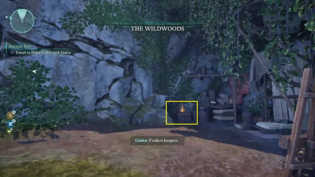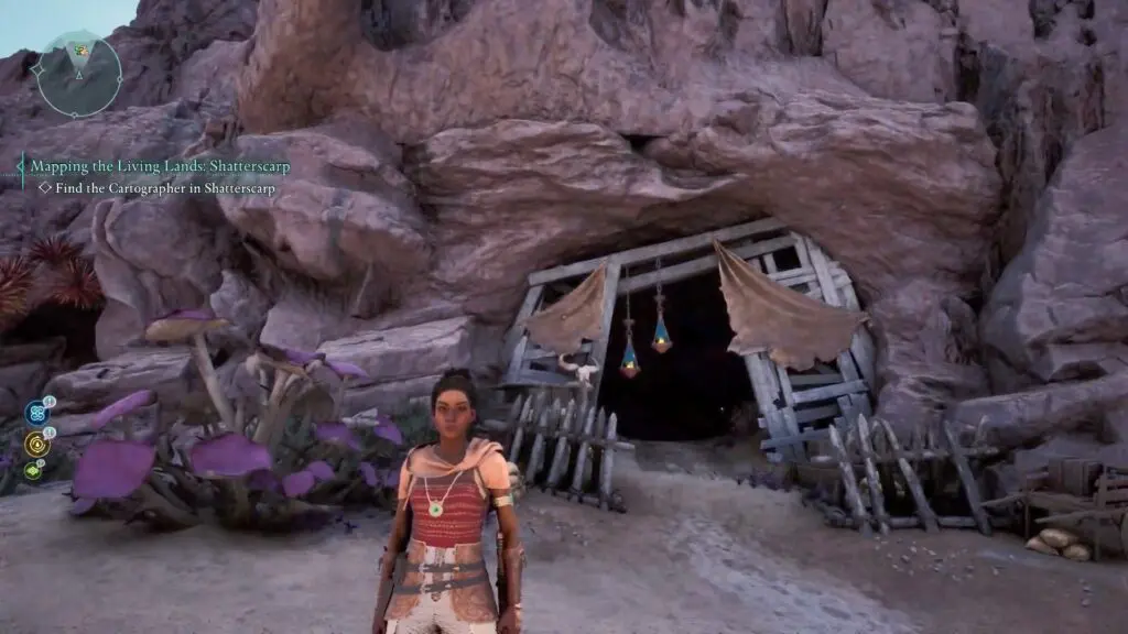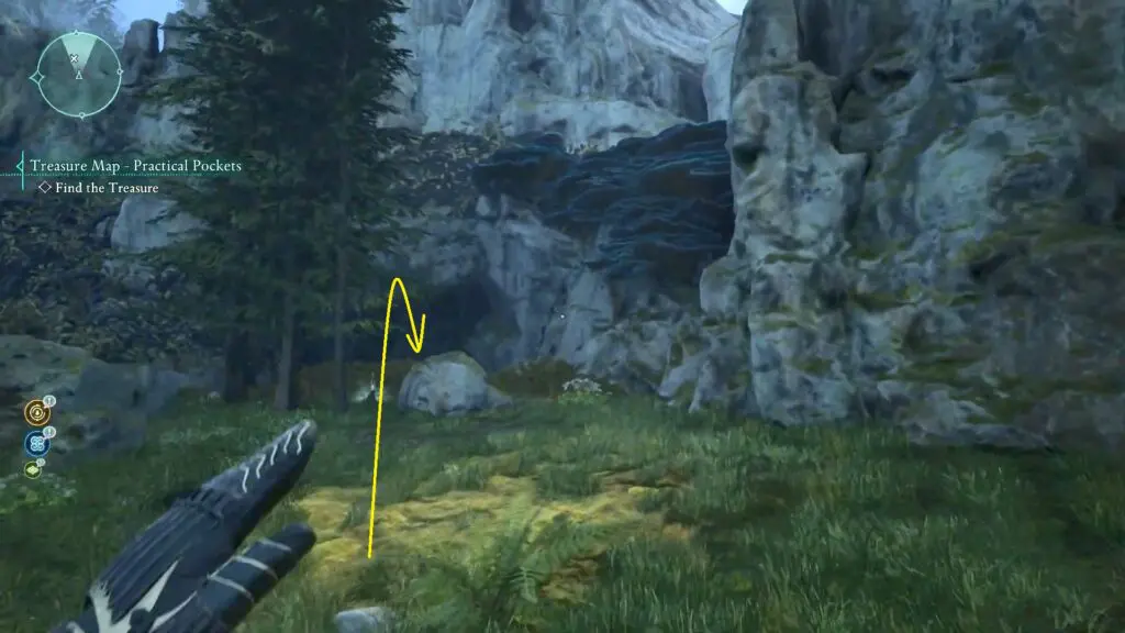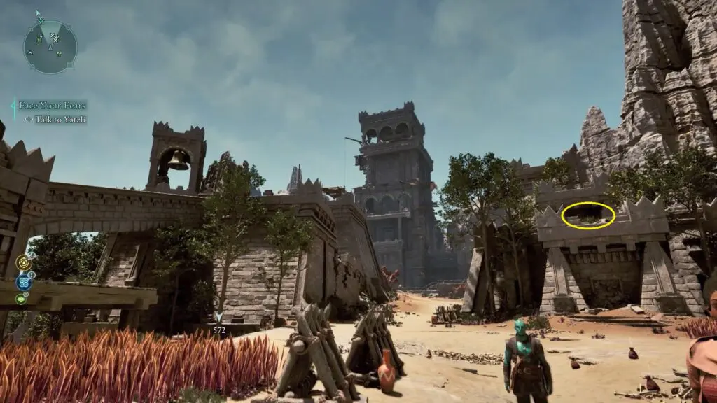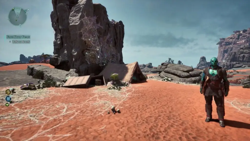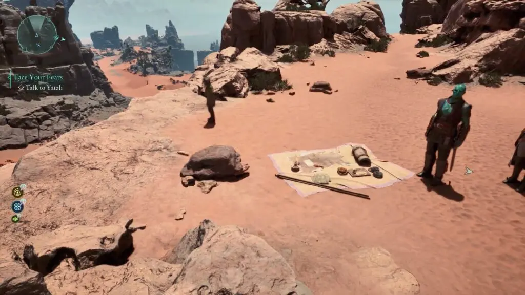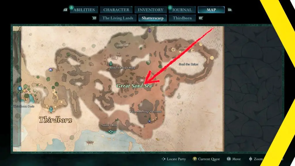 Next, head to the red riverbed, northeast of the Sulfur Mines Basecamp in western Shatterscarp. Look for a rock bridge shape. Go underneath it, and on your left, you’ll find a small hidden space with the treasure inside!