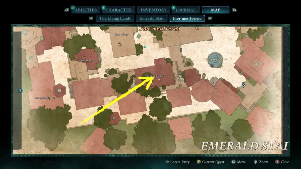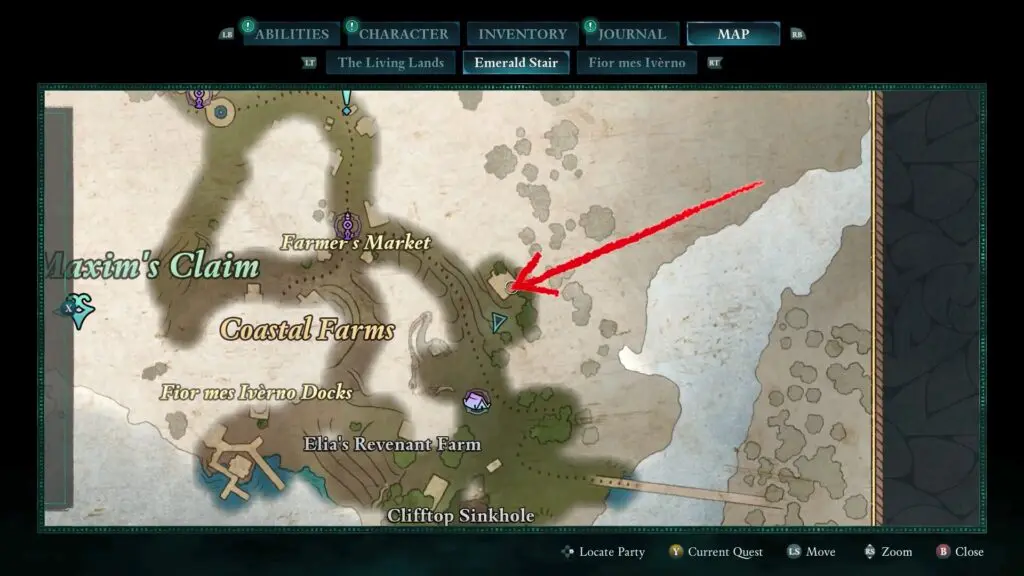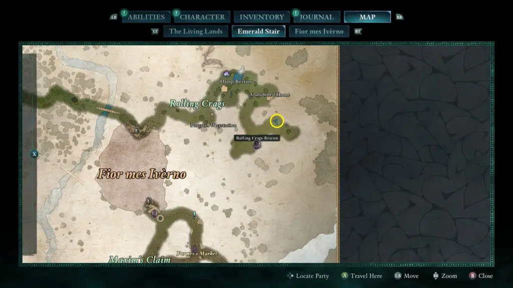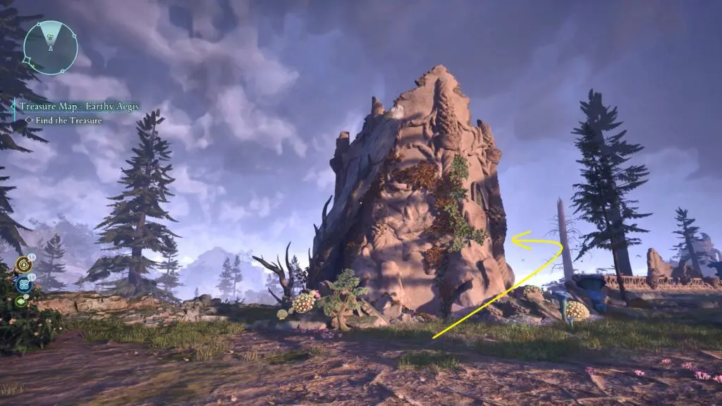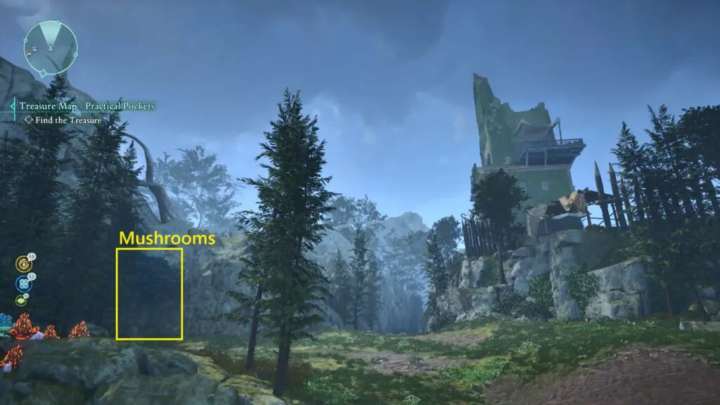To find the treasure chest, head northeast of Fior Mes Iverno, near the Rolling Crags Beacon. Face the ruined tower shown on the treasure map and look to the left side for a mushroom patch along the mountain wall.