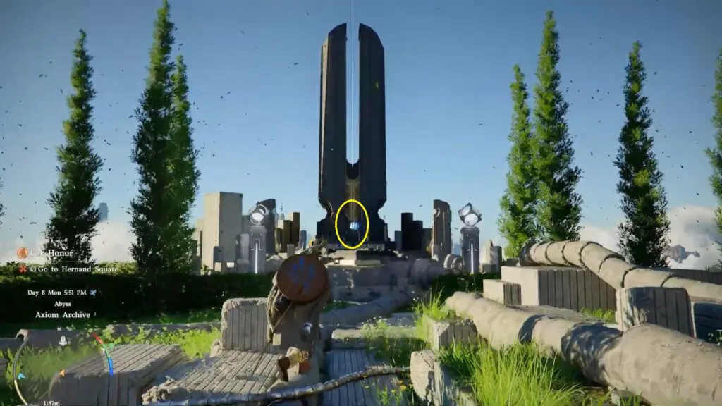 Once you arrive through the Abyss Gate in Hernand Castle. Then, head northeast from your starting point and look for a tall tower with a glowing laser. Go near the tower, and you should be able to spot the artifact sitting on a pedestal near this tower.