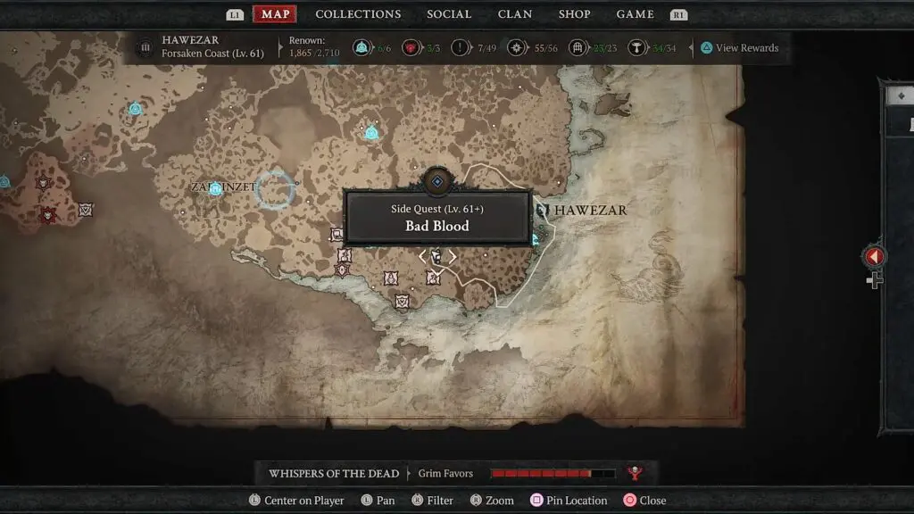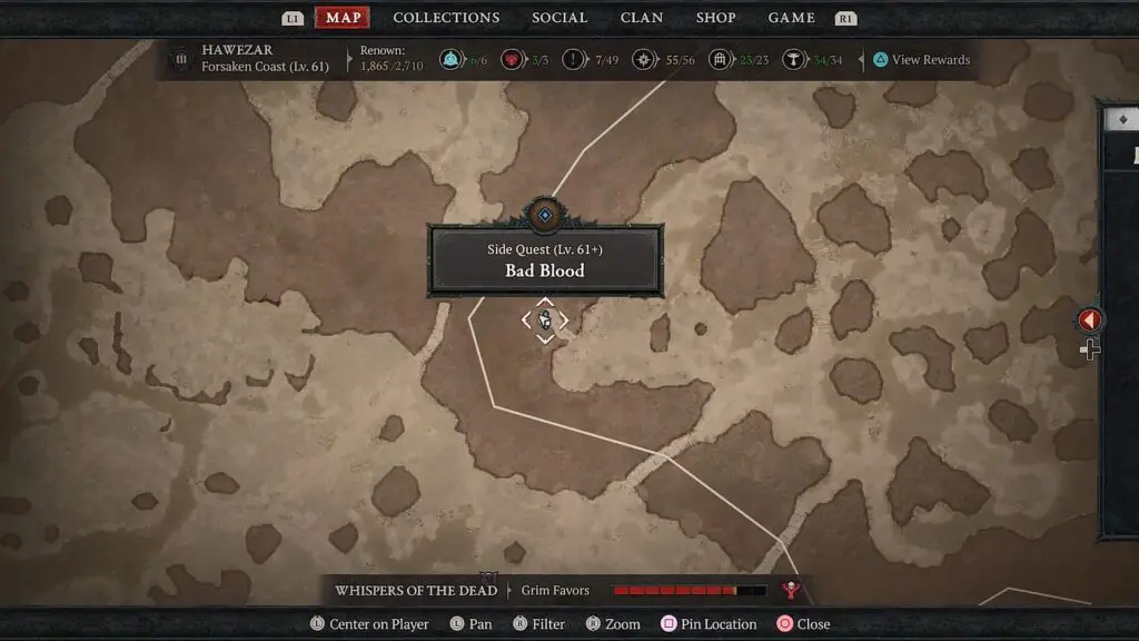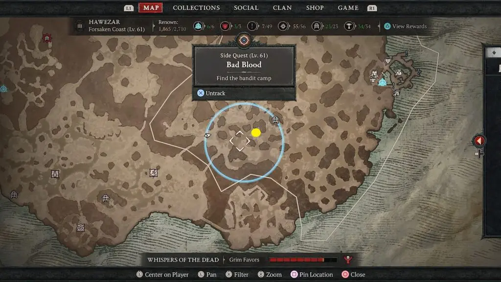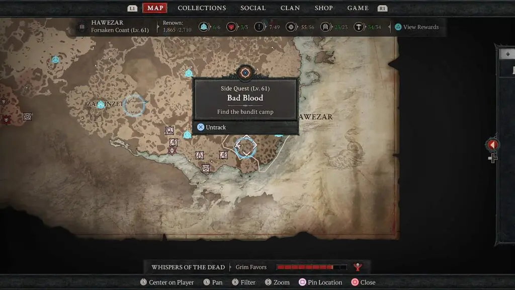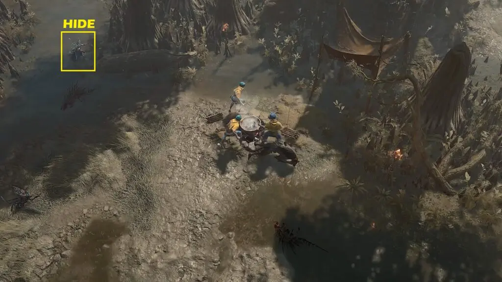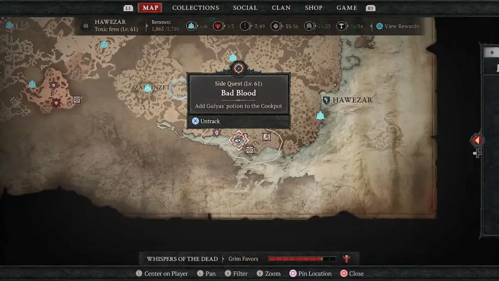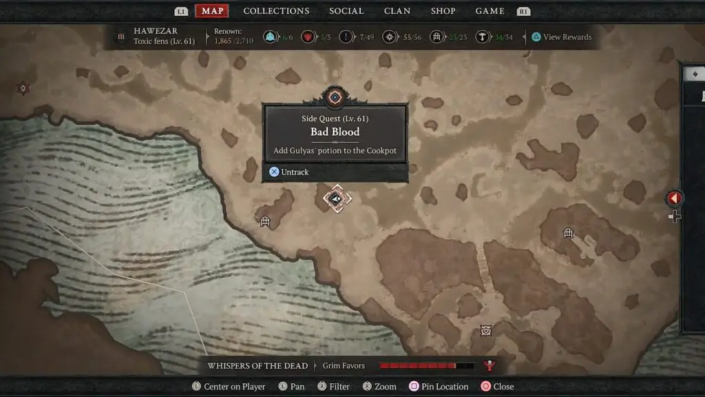 This guide shows the complete walkthrough of the Bad Blood side quest in the Diablo 4 game, released on 6th June 2023. You get the quest by talking to Gulyas in the Forsaken Coast area in the Hawezar region as shown in the pictures below. For the quest, you need to find two bandit camps, add Gulyas Potion in the cookpots there, and then hide near the cookpot.