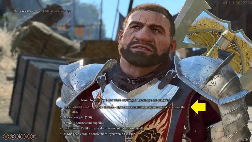 Head southeast from Arfur’s mansion and speak to Manip Nestor at the Requisitioned Barn. Pass the Persuade check to convince him to inspect the donation for anything harmful.