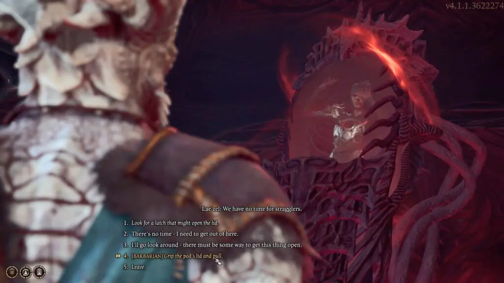 Choose the following dialogue – “[Barbarian] Grip the pod’s lid and pull“