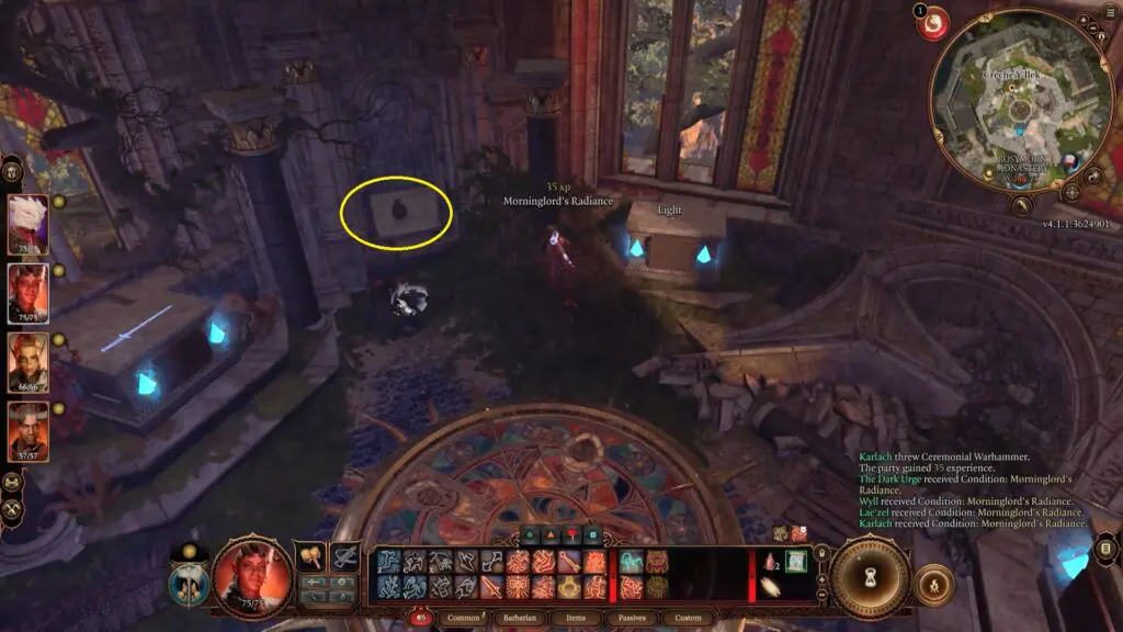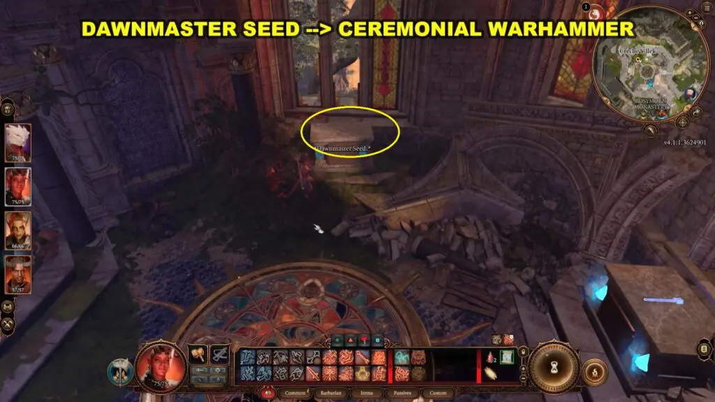 This walkthrough guide will show you how to solve Stained Glass Puzzle in Rosymorn Monastery and get Dawnmaster’s Crest in Baldur’s Gate 3. The Rosymorn Monastery’s stained glass chamber contains four windows, each with a stone pedestal in front of them. You must gather three weapons scattered about the monastery to solve the puzzle: Rusty Mace, Ceremonial Warhammer, and Ceremonial Battleaxe.