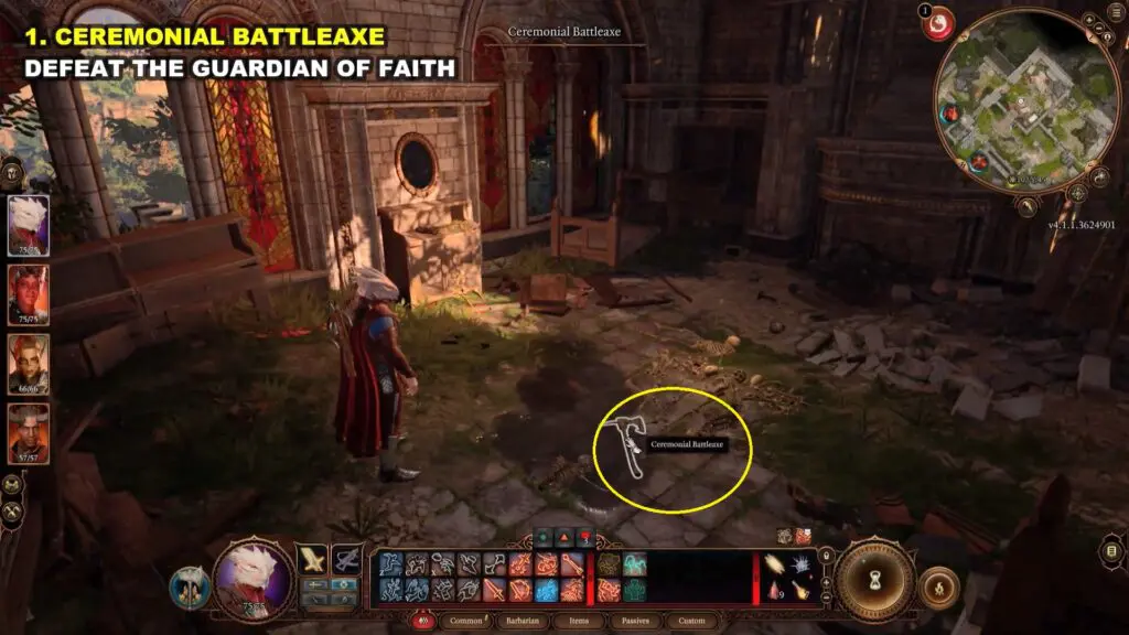 Enter the room by jumping over the debris that is blocking the door. Inside the room, you’ll find the Ceremonial Battleaxe and an active Guardian of Faith spell. After defeating the Guardian, take the Ceremonial Battleaxe.