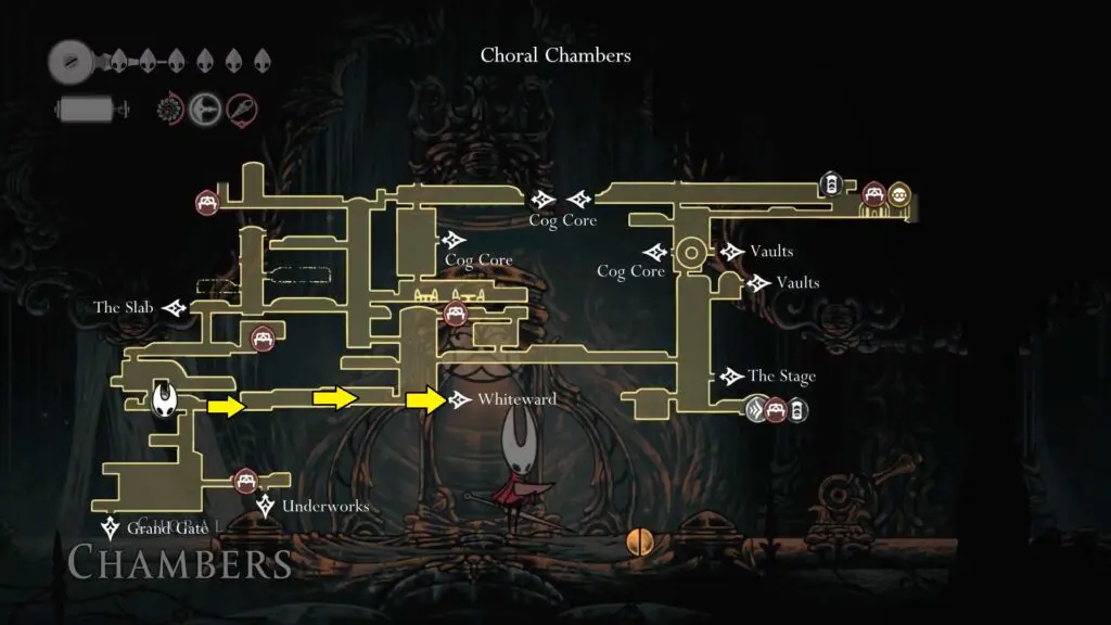 After accepting the quest, you can use the nearby Ventrica device to fast travel to the Coral Chambers. Once you arrive at Coral Chambers, head all the way to the right on a mostly straight path. Eventually, you’ll reach the White Ward entrance (refer to the map).