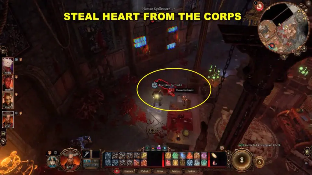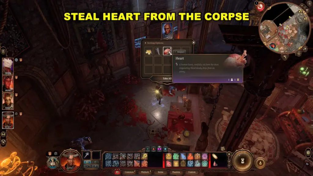 To begin solving the puzzle in the Balthazar room, look for the human corpse beside the bookcase. Take the heart from the body.
