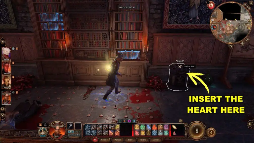 Then, to the right of the bookshelf, interact with the Ancient Altar and insert the heart in the altar. This will finish the puzzle.
