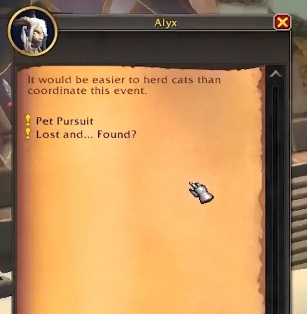 Speak with Alyx at the main tent of the Caverns of Time to pick up the prerequisite quest – Pet Pursuit. She is wearing a white dress and is the Volunteer Assistant Guest Relations Manager.
