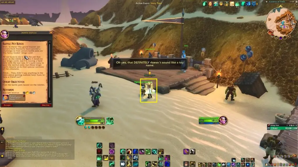 After speaking with Alyx at the event location, proceed to the left of the stage to find an NPC named Jepetto Joybuzz near the pet playground. Speak with NPC to receive the ‘Battle Pet Bingo’ quest for the 20th Anniversary event. In this quest, the player needs to find the battle pets based on the riddles.