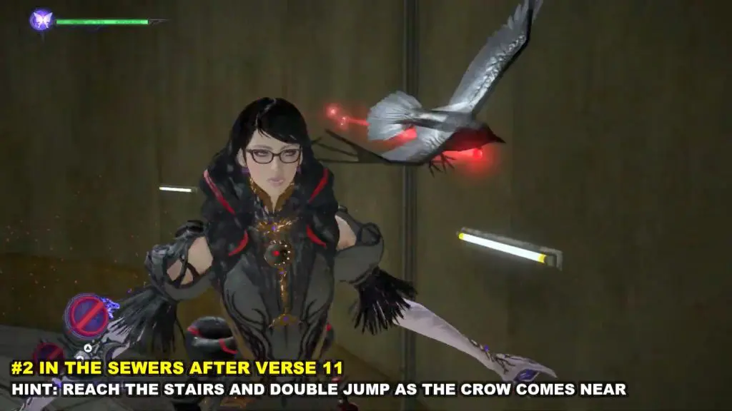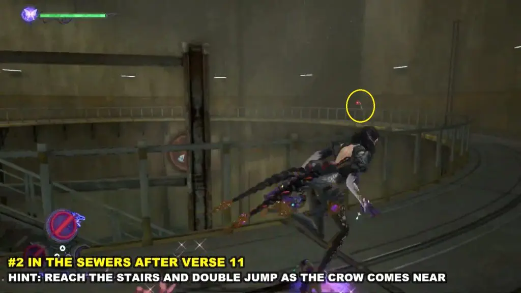 You’ll find the crow sat on some railings at the top of a circular room inside the sewers under Shibuya. Reach the stairs and double jump as the crow comes near.