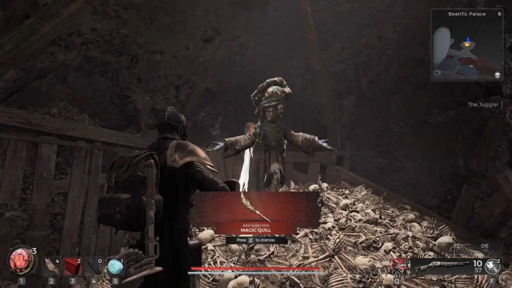 Continue along the path until you approach Jester at the end, who is sitting on a heap of bones. Interact with him to see him perform. He will give you the Magic Quill after the performance.