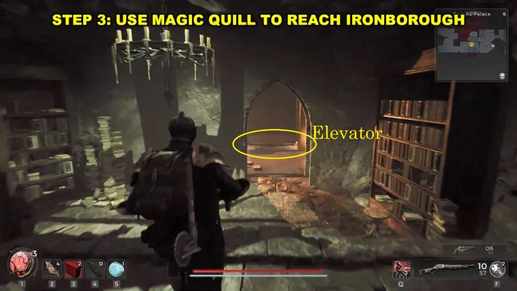 Retrace your steps back to the basement’s library, where you’ll discover an elevator. Take the elevator to reach the main library, then head towards the right side wall. Use the Magic Quill to draw a door, which will lead you to Ironborough.