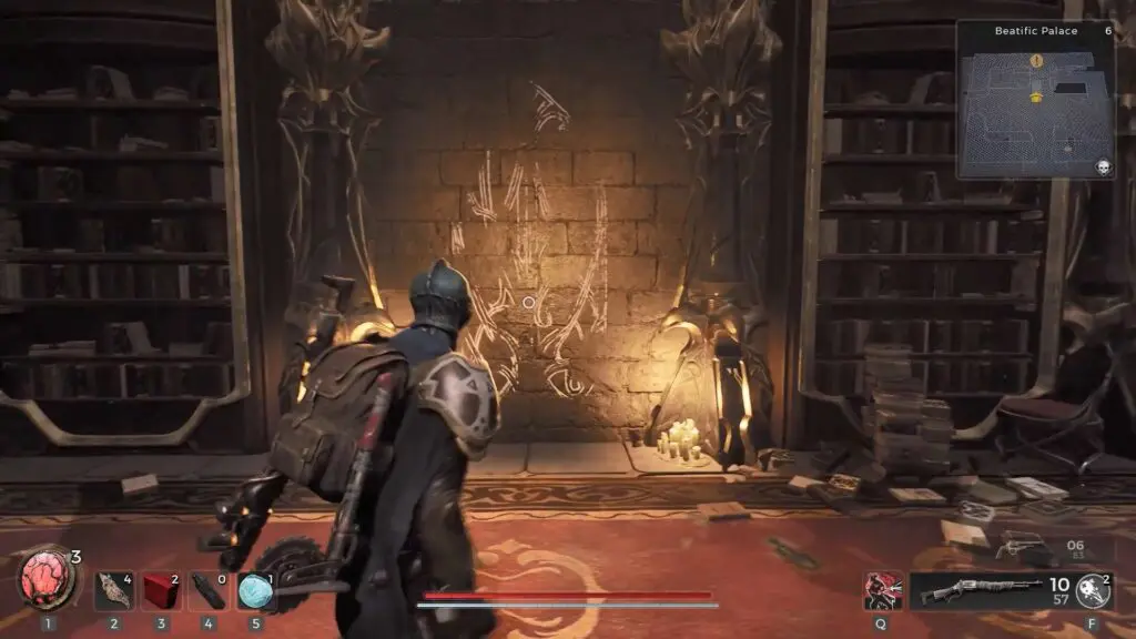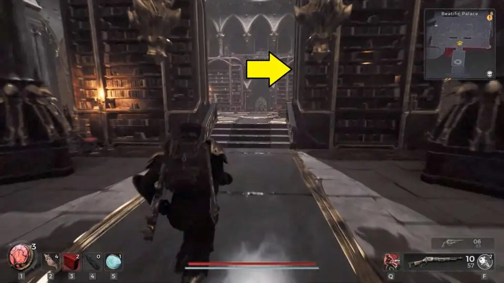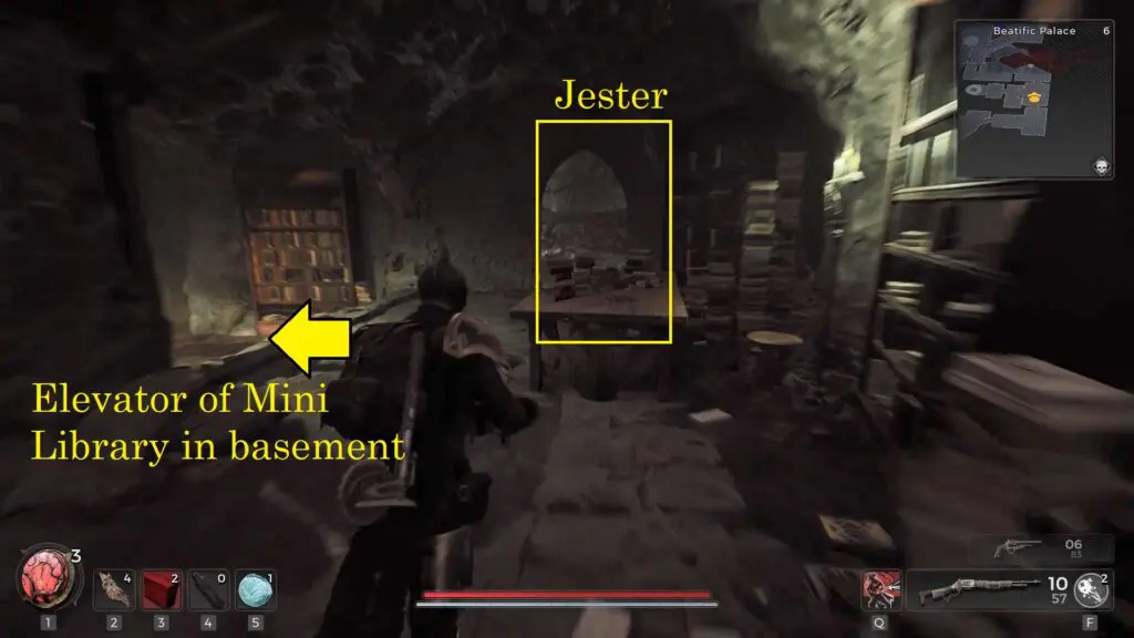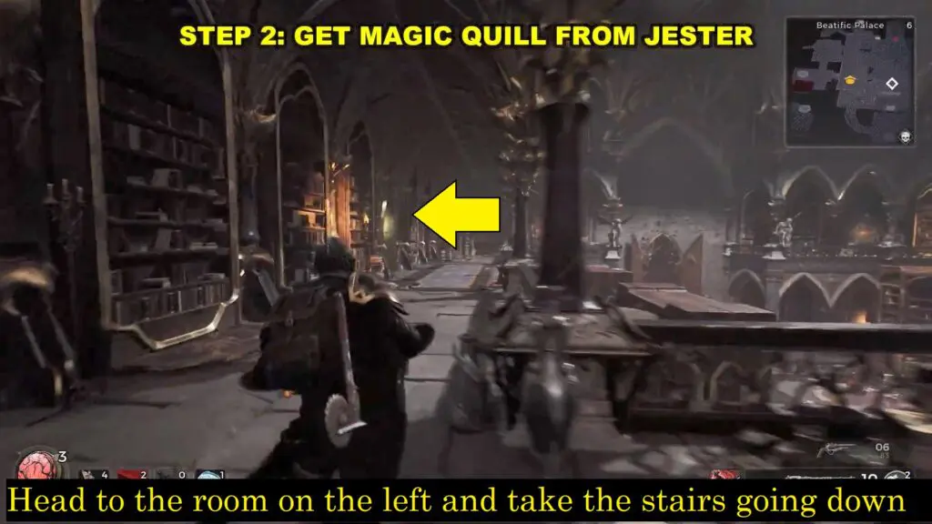 Then, walk to the left and up the spiral stairs to the library’s upper floor. Head to the room on the left and take the stairs down at the end. Continue going downstairs to reach the basement.