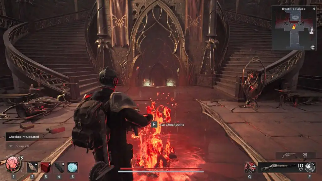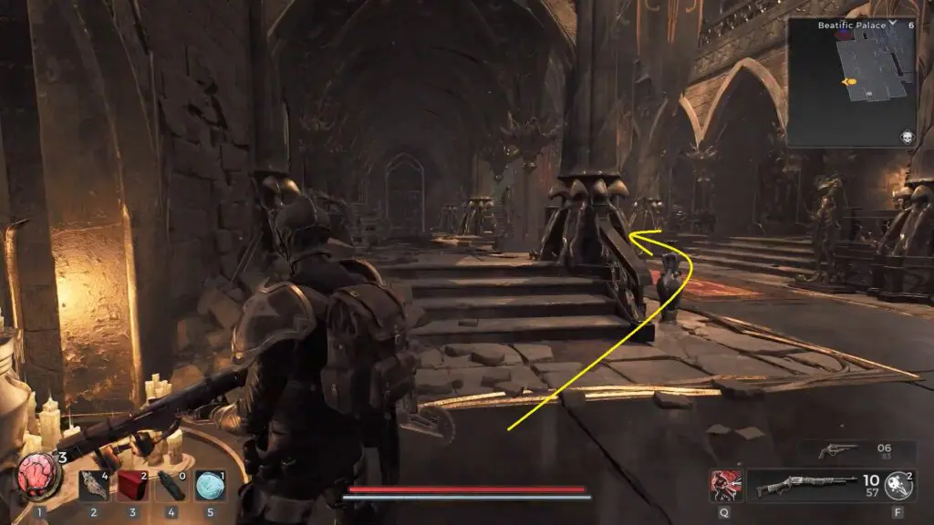 Upon entering the Beatific Palace, proceed past the checkpoint located after the stairs. Take the left path and proceed to the elevator. Defeat the enemies in the area until you will reach your first Checkpoint.