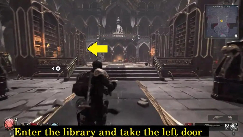 Climb up the spiral stairs to enter the library and take the left door. There are three doors, but only the one to the left is open
