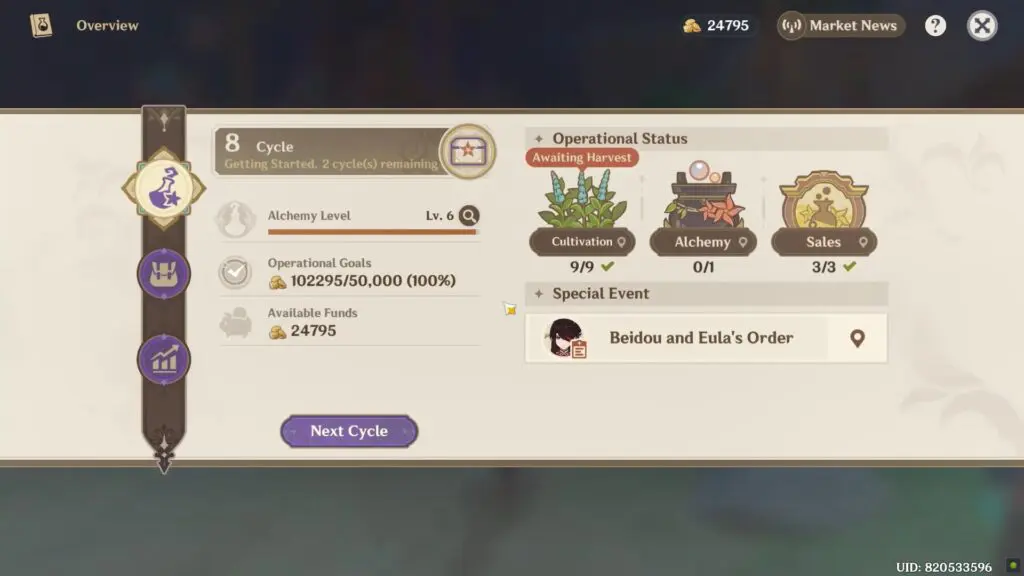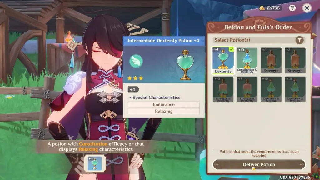 After brewing the correct relaxing potion, go to where Beidou and Eula are submit the newly brewed potion, and receive your reward.