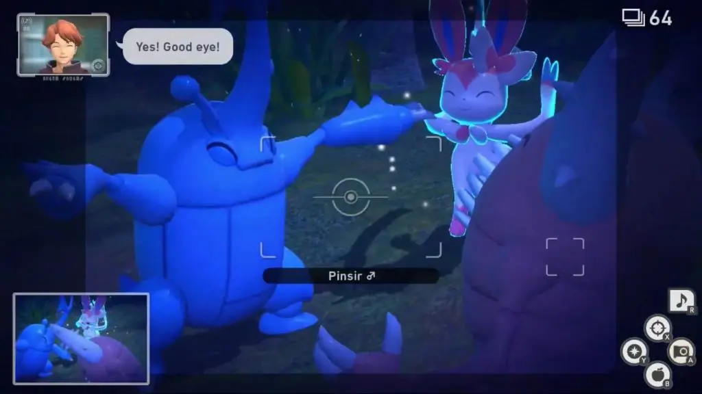 Best Frenemies Request: New Pokemon Snap Guide Post published:May 2, 2021 Post category:New Pokemon Snap Best Frenemies: Pinsir 4 Star Pose Request | New Pokemon Snap Guide Go to Florio Nature Park (night)Throw Illumina Orb on buried Pinsir. And then, press the scan button a few times to make Heracross fall from the tree. A little ahead (just after crossing the lake) you will find Pinsir and Heracross fighting. Turn to your left and throw Illumina orb on the sleeping Sylveon to wake it up.Play Melody as you approach near the fighting Pinsir and Heracross.Sylveon will then appear and the three of them will laugh it off. Take picture of Pinsir laughing with the other two (4-star pose) to complete this request.RELATED: New Pokemon Guide & Walkthrough