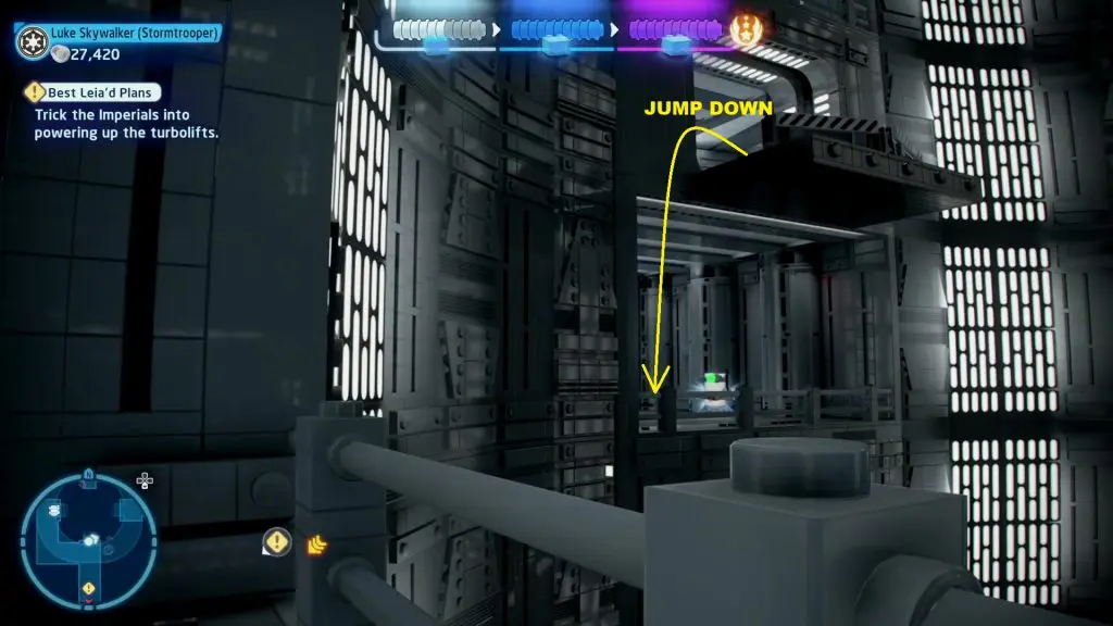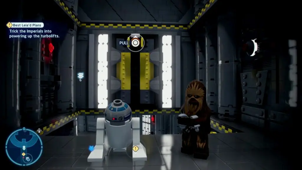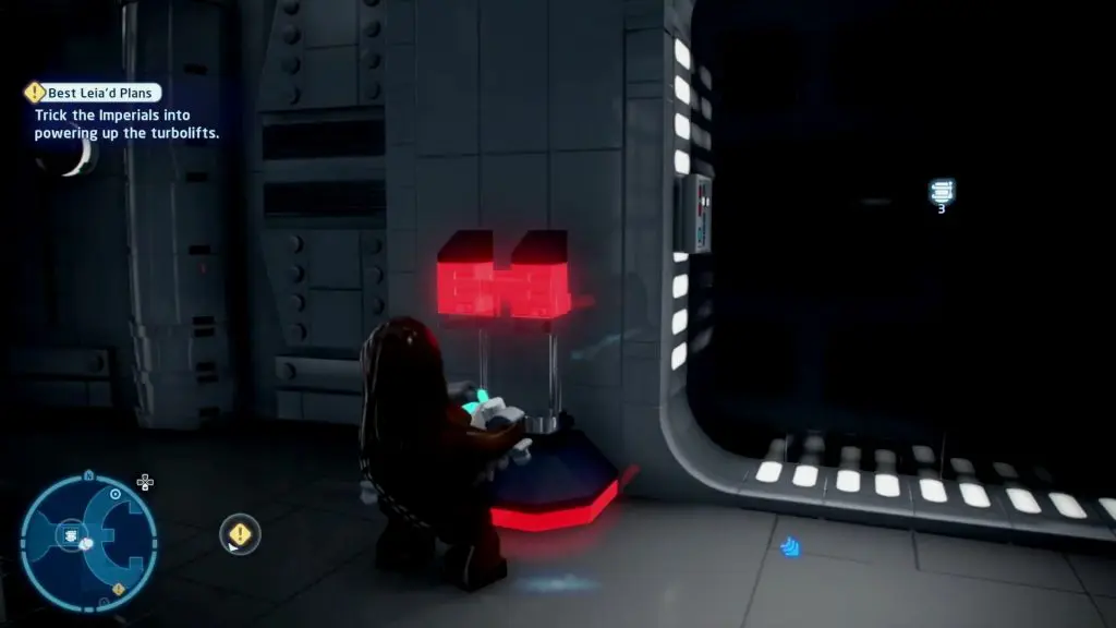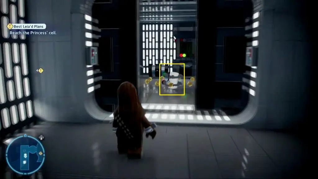 Go to the south side of the fourth floor. Then use a droid to pull open the door as shown in the picture below. Then proceed inside the room to find the third Mouse Droid. On destroying the three mouse droids, you will get a Minikit.