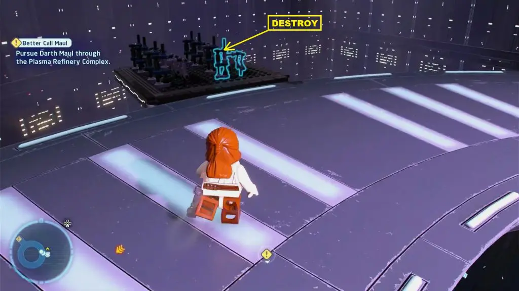 Continue pursuing Darth Maul, and he will jump down to the lower level and destroy the bridge. Jump on the pedestals to cross the destroyed bridge. Darth Maul will destroy another segment of the bridge. Don’t cross this broken segment yet. Turn left from the broken bridge to reach the cleaner droid as shown in the pictures below.