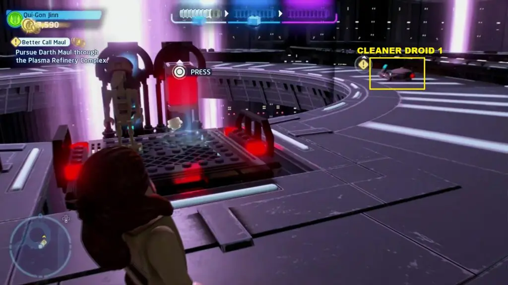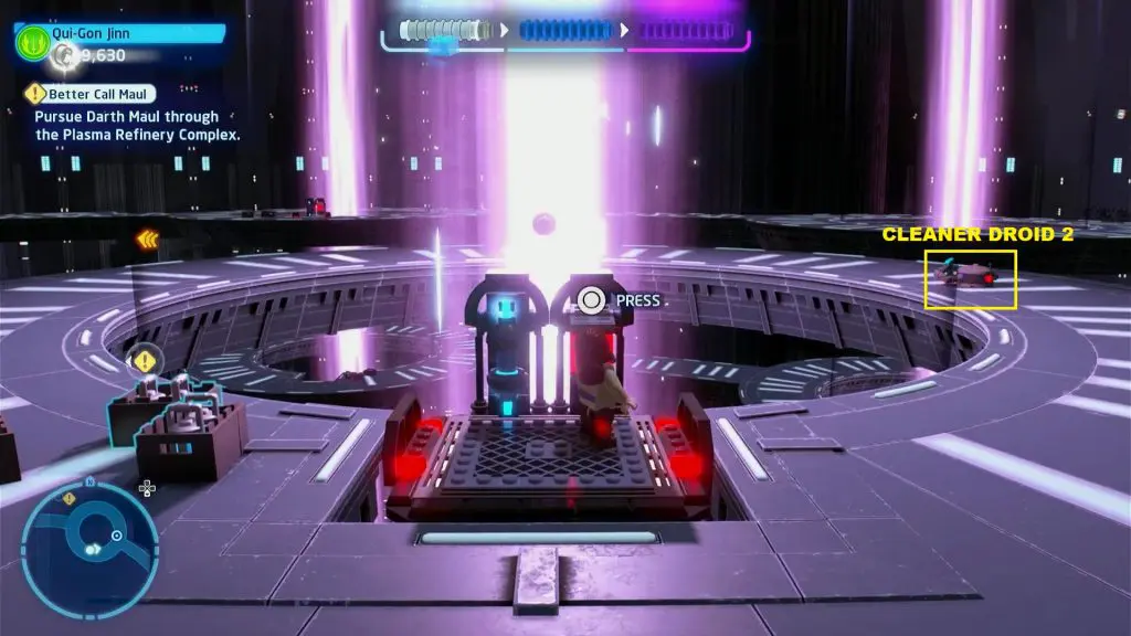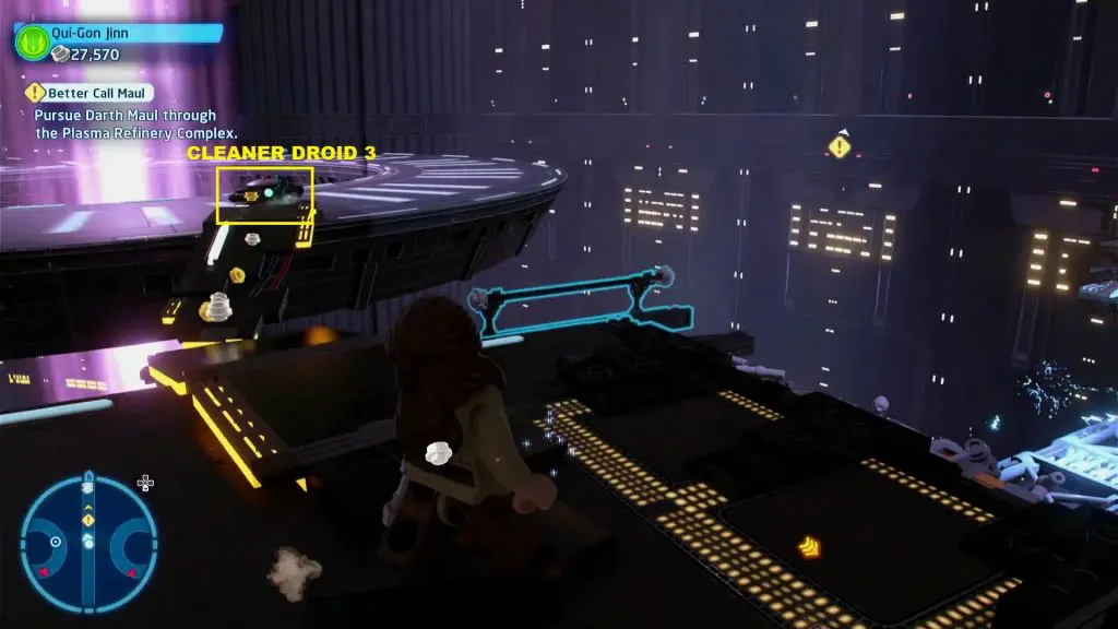 As you are pursuing Darth Maul, he will take the elevator to the upper level. Use the elevator to reach the upper level. Then turn right to find the cleaner droid as shown in the pictures below.
