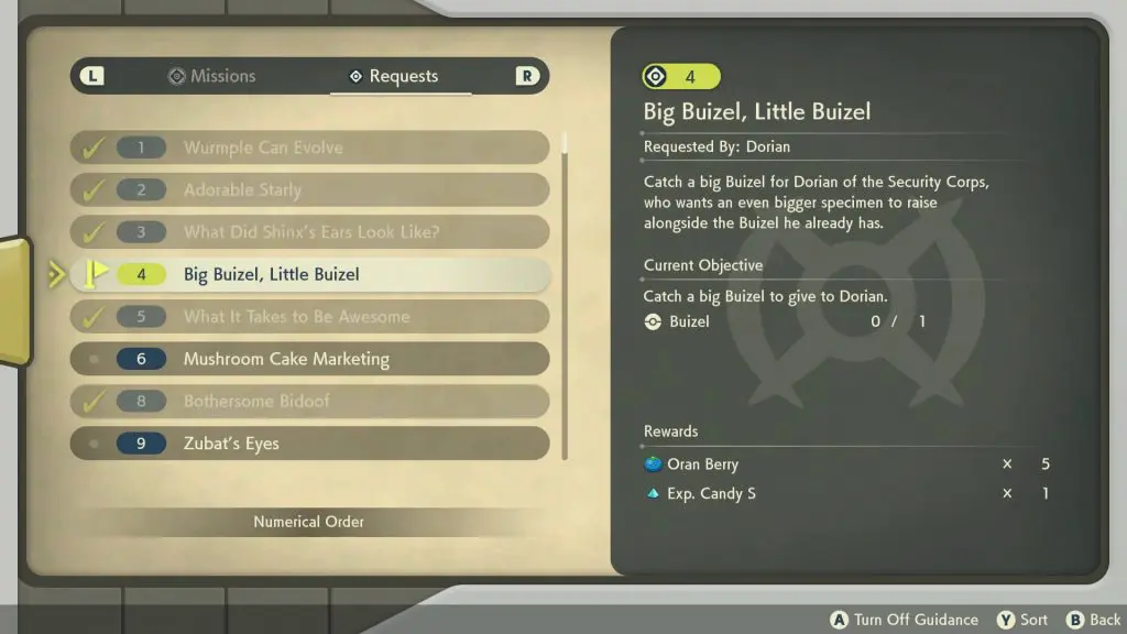 This guide shows the complete walkthrough of “Request 4: Big Buizel, Little Buizel” in Pokemon Legends Arceus. For this request, you will need to find and catch a Big Buizel.