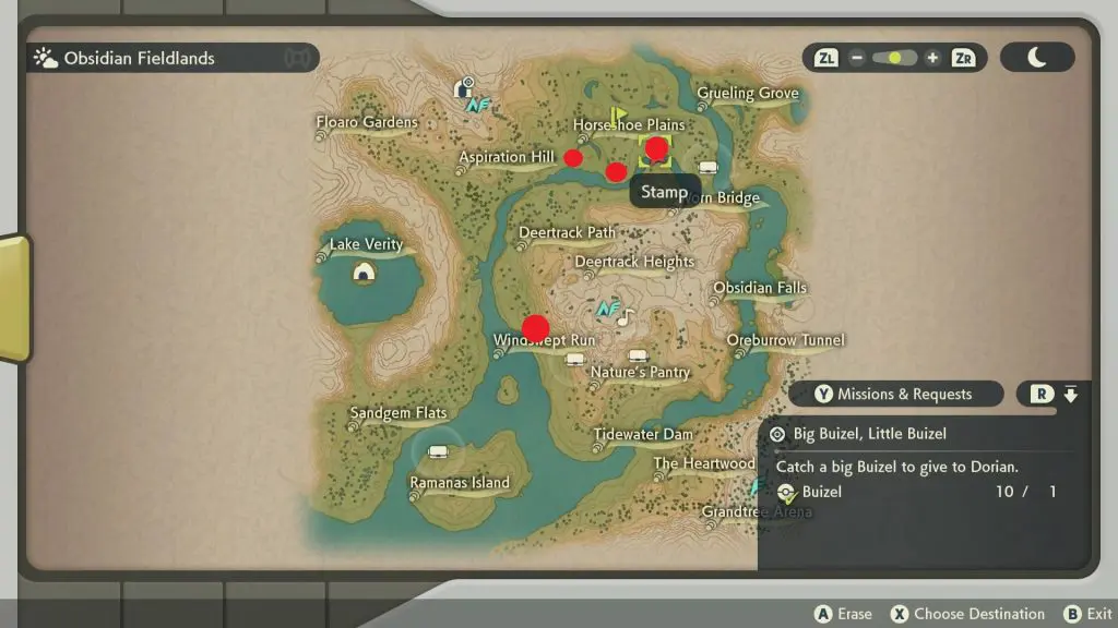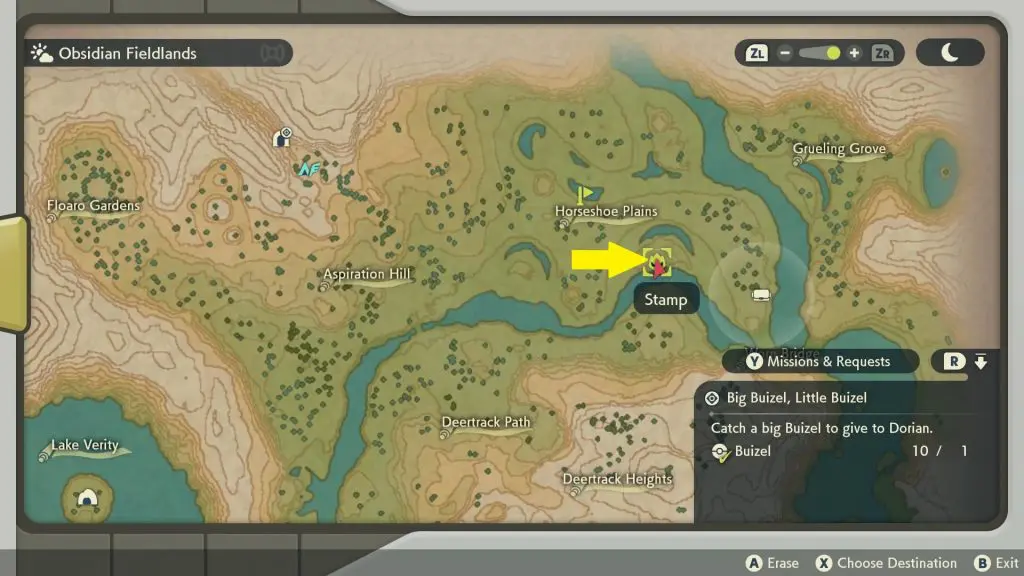 You will find Alpha Buizel in Obsidian Fieldsland at the location shown in the picture below. They have a height of 4’2″. Catching an Alpha Buizel also satisfies the criteria to complete the quest. So, if you don’t want to go through the hassle of catching a lot of Buizel to find a big one, you can catch an Alpha Buizel to complete the quest.
