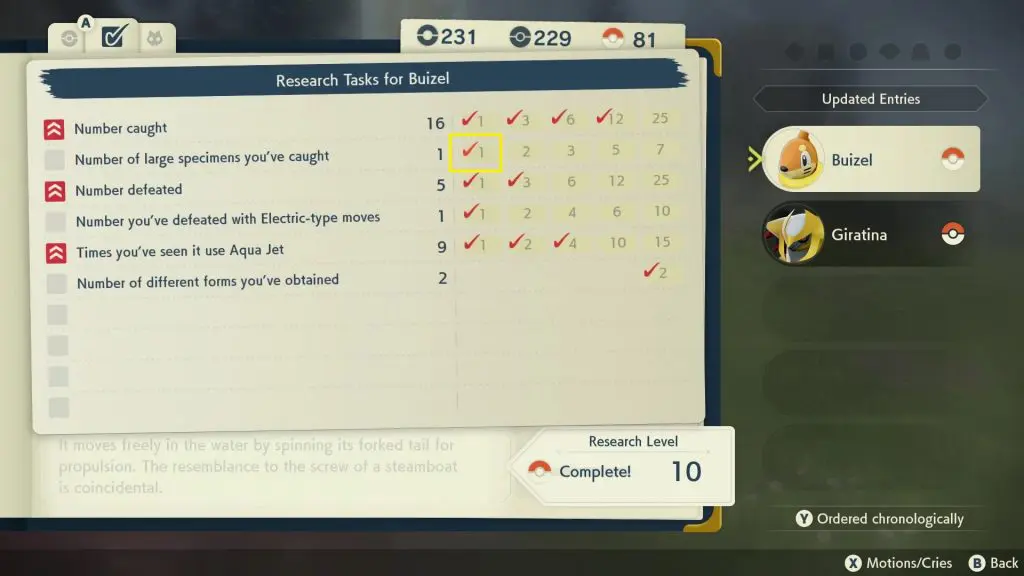 You can also check whether you have caught a Big Buizel by seeing the Large Specimen Research Task of Buizel.