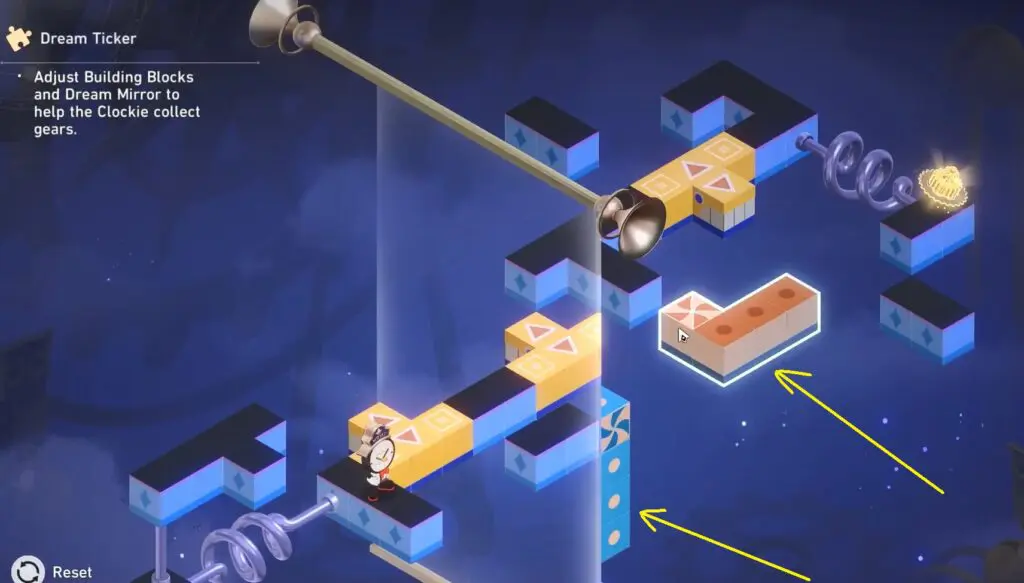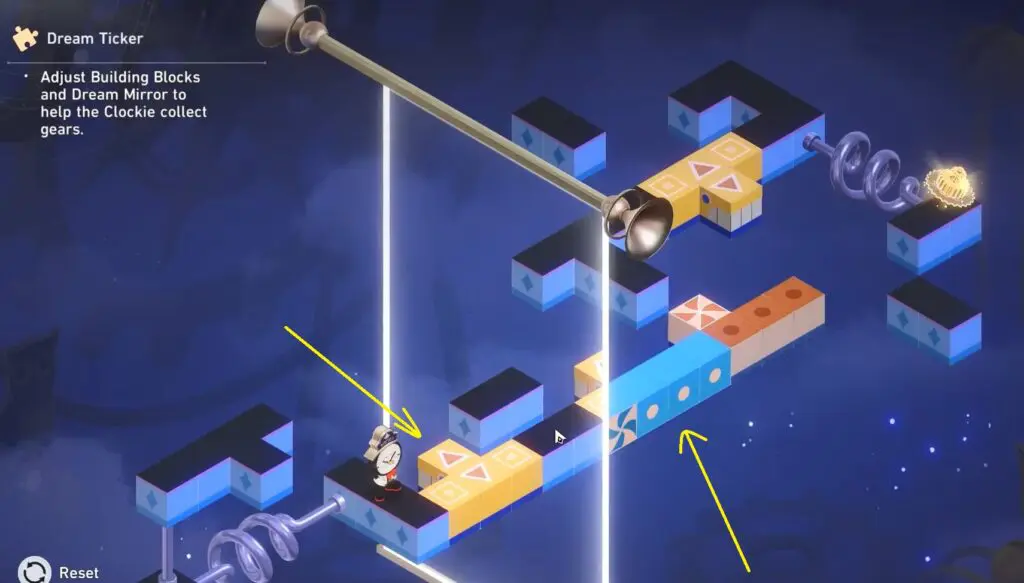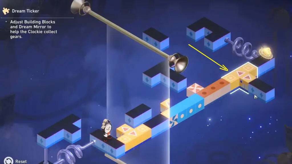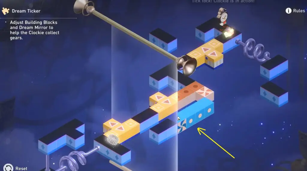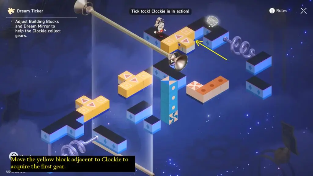 Move the yellow block adjacent to Clockie to acquire the first gear.