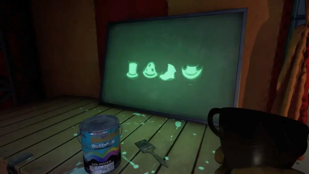 Next to the keypad is a blackboard with four different hats drawn on it. These hats are your main clue. Each hat is a different shape and style—some might be tall, round, wide, or pointy. The order in which they appear on the board is the code sequence to unlock the door.