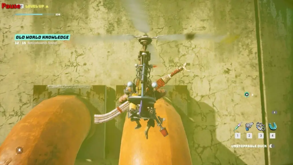 Here a combination of different abilities is needed to climb the pipe of the chimney. And to reach the metal hook that can be used to reach the top of the chimney.
