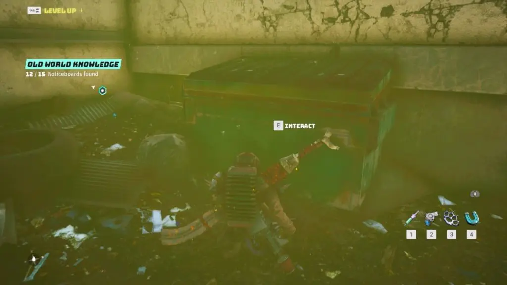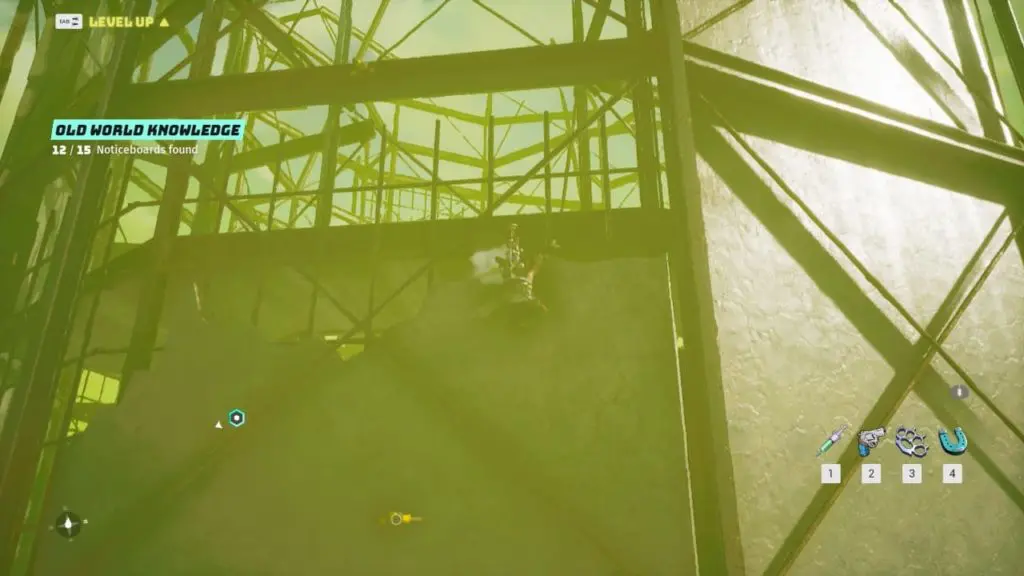 Old World Gadget: Head inside building #2 marked on the map. Climb up to the metal catwalk. You will find the Old World Gadget (Rotation Puzzle) in the middle of the building. Rotate each of the nodes so that colors match each other.