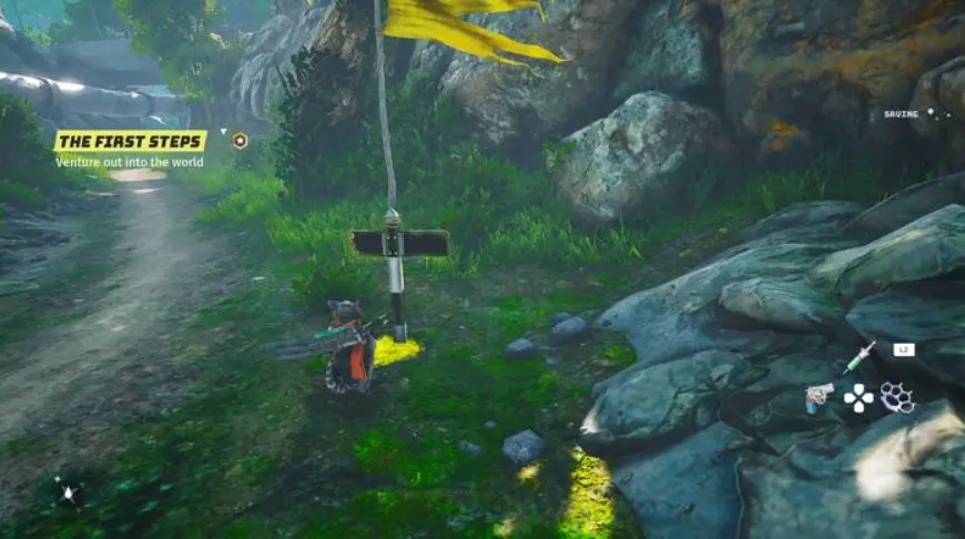 - First, find a fast travel point in Biomutant and interact with it. The fast travel point is a yellow flag on a pole (signpost ).