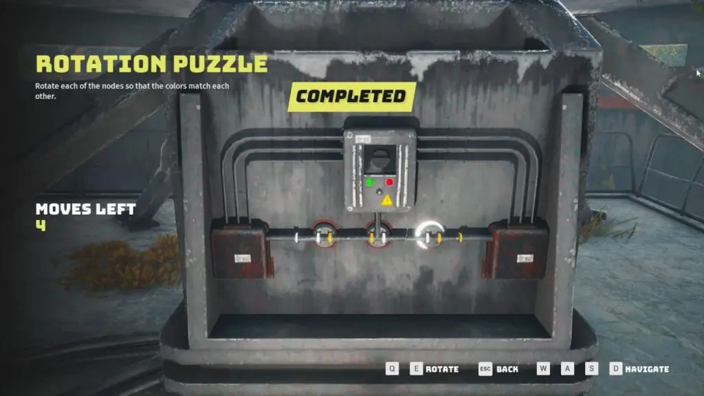 After reaching the desired location, go into the building and approach the generator to solve the Rotation Puzzle. Match the colors by rotating the nodes to matching up the color symbols. Once this puzzle is complete you will have control of the satellite dish above.