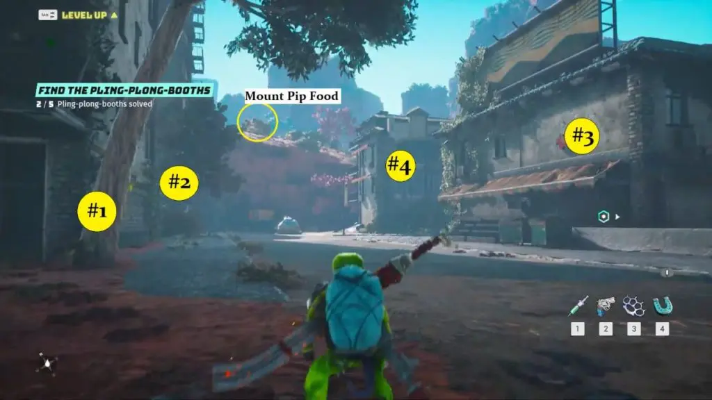 Mount Pip Food: It is a pile of branches and leaves located on higher ground behind the buildings as marked on the map. You can climb on building #4 and fly to that location. Once you reach the location, just run through the pile of branch and leaves