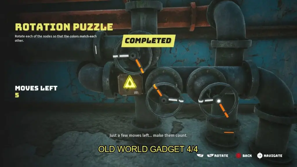 At the end of the underground area, you will find a pool of drainage water blocking your further progress. Look right to find the next old World Gadget which is a Rotation puzzle. Here rotate the nodes of each pipe to match the color and this will drain the water.