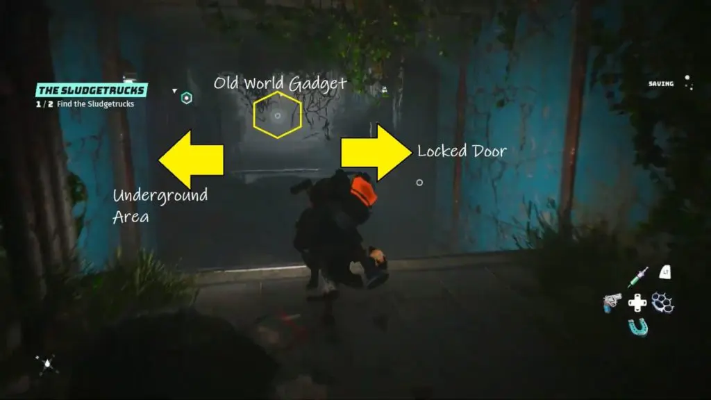 Climb down the manhole just beside Resource Totem #1. Continue to follow the underground drainage pipe and once the area opens jump onto the raised platform.